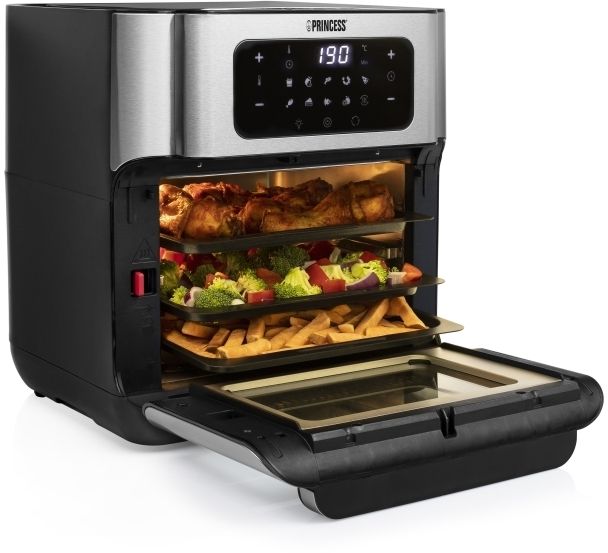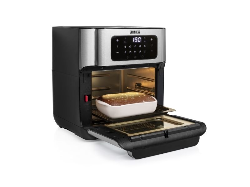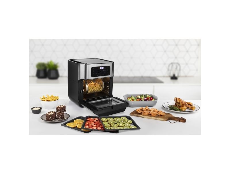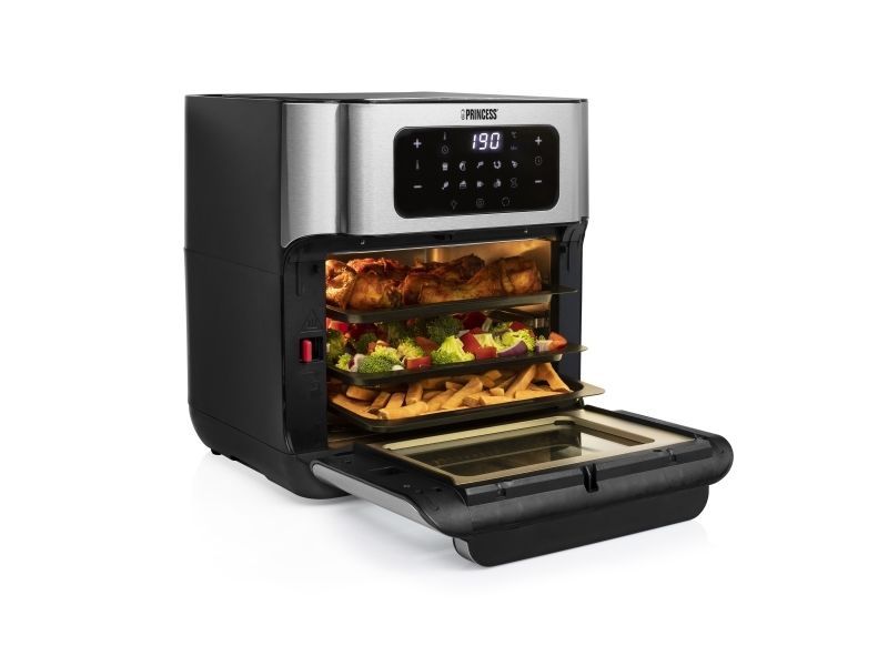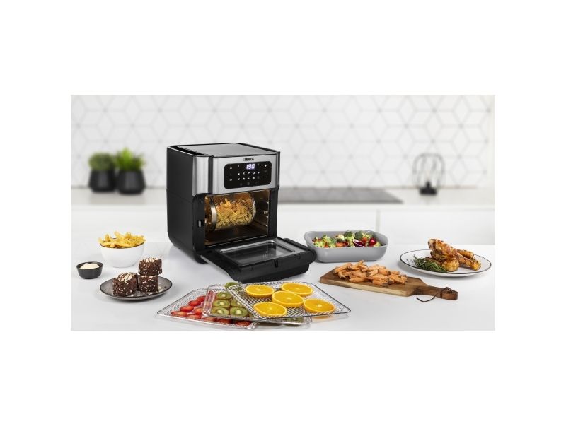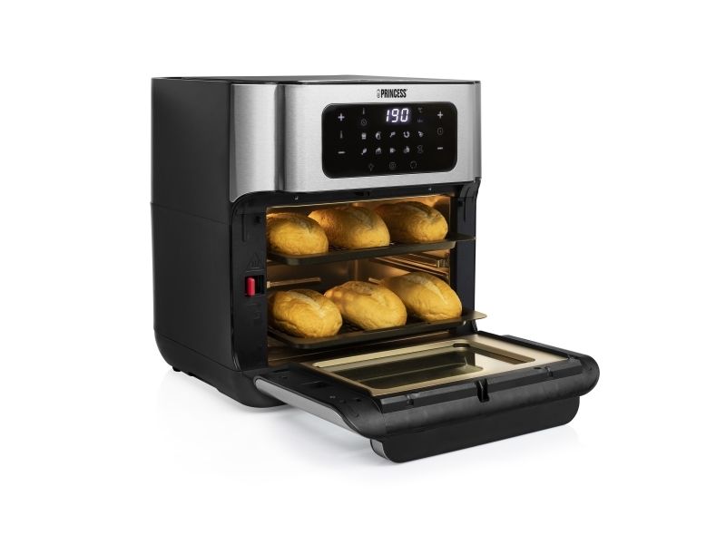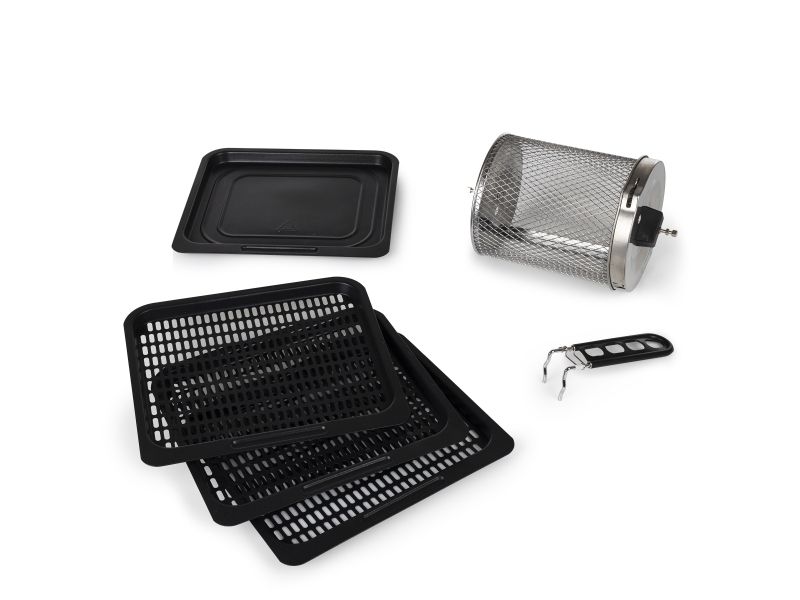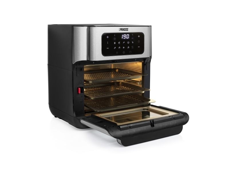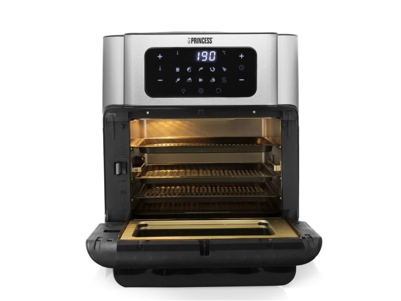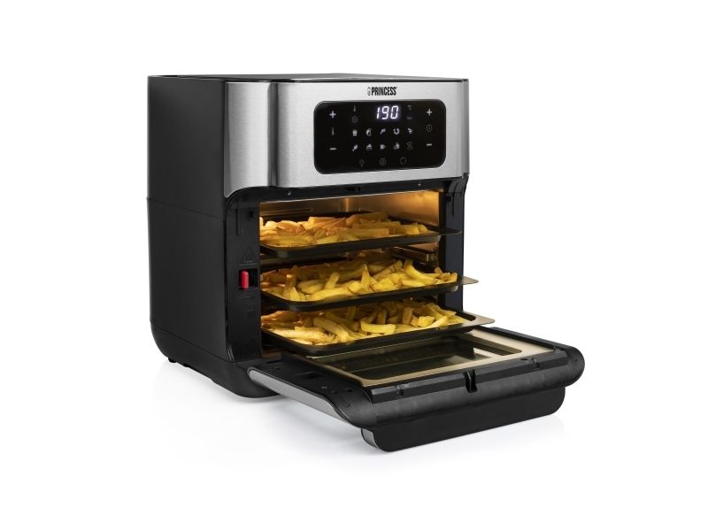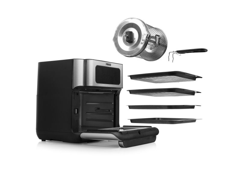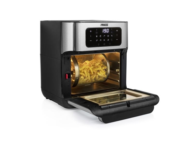 Are you in doubt whether you should choose an air fryer or a mini oven? The Princess 182065 Aerofryer Oven is the perfect device for you. The luxurious combination between an air fryer and a mini oven can grill, bake, fry, roast, and even dehydrate. The rotating mesh basket makes sure you will get the most crispy chips ever and does so without you having to shake every 5 minutes. Furthermore, you can bake loads of snacks on the 3 baking plates with a special air convection technology.