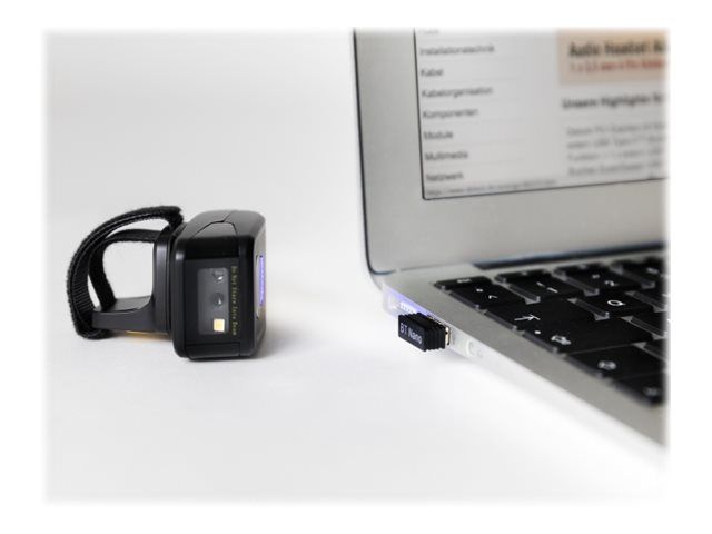This ring barcode scanner by Delock can be wirelessly connected to a PC, laptop or directly to a mobile phone or tablet. All common 1D and 2D barcode types can be precisely captured even at long distances. Additionally, the scanner recognizes barcodes displayed on displays and monitors.