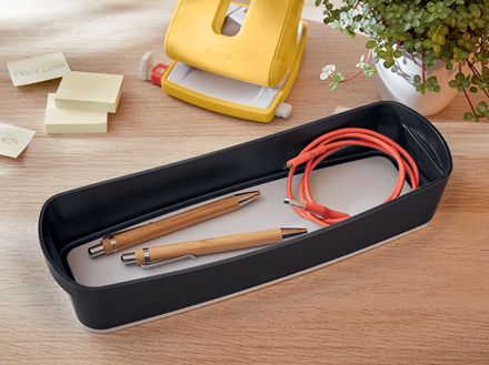 The Leitz MyBox modular storage system lends a unique style to your home or office. The small storage tray is sturdy and made of premium quality material in a high gloss finish with a dual color effect. Made for desktop or in-drawer use for optimal organization of pens and small items.