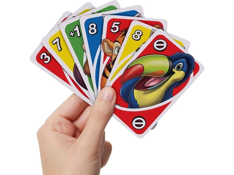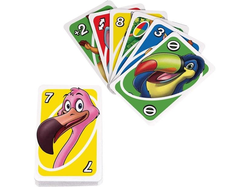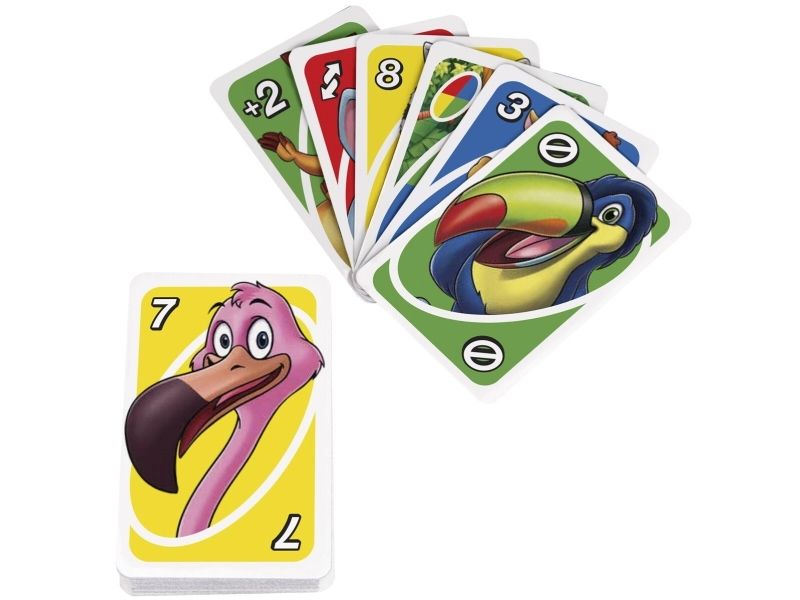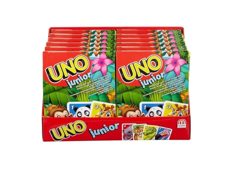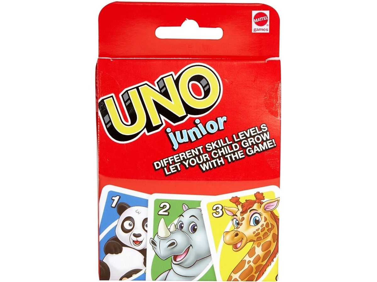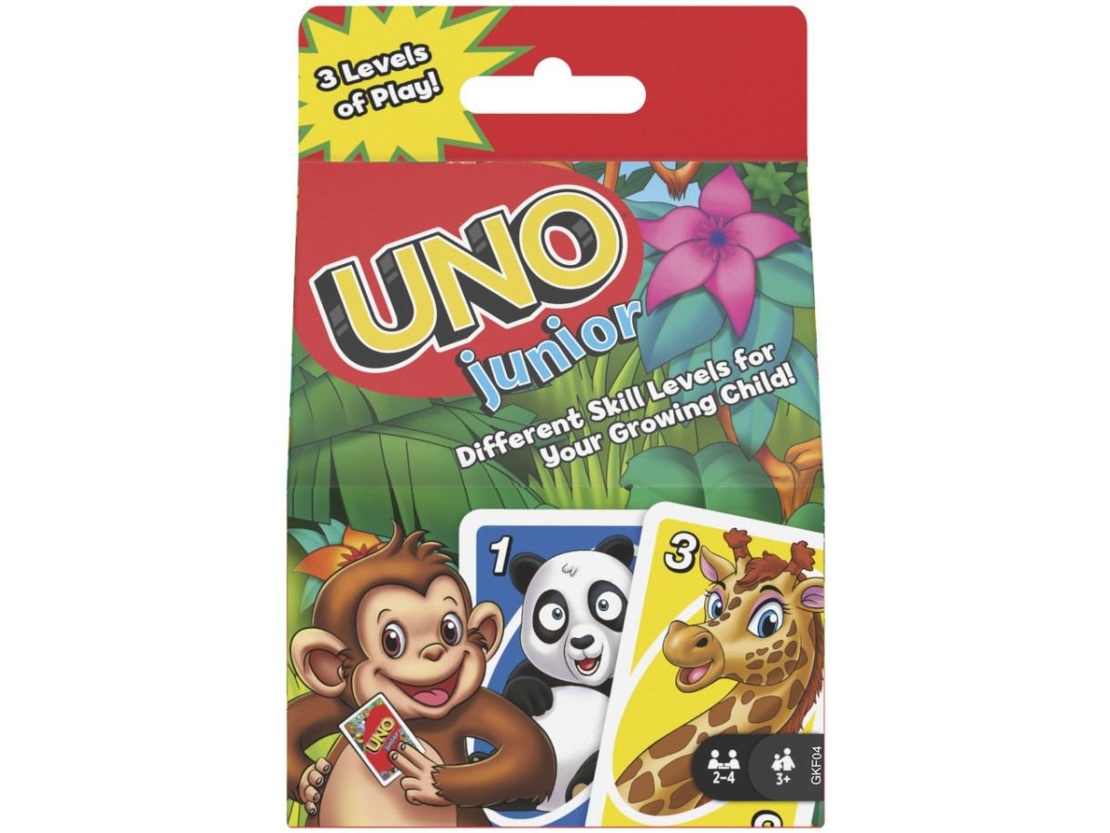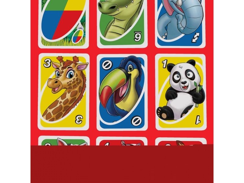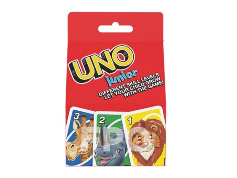 Dette forenklede UNO-kortspillet for yngre spillere har flere spillnivåer, slik at barna kan vokse med spillet. Kortene har en bedårende dyregrafikk for hvert nummer fra 0 til 8, noe som gjør det enkelt for barn helt ned i treårsalderen å finne to like. Med tre spillnivåer kan spillet holde tritt med utviklingen til et barn. Spillerne konkurrerer om å bli kvitt alle kortene sine ved å matche dem med kortet øverst i bunken, enten etter farge eller etter dyr/nummer. Når du bare har ett kort igjen, må du ikke glemme å rope UNO! Farger og dekor kan variere.