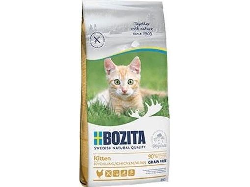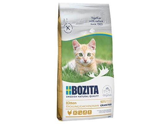 Bozita kitten grain-free chicken is a complete food with small pieces for kittens and young cats. The food meets the high energy and protein needs of young cats, which optimises growth and muscle mass. The relatively high energy content is also excellent for pregnant and nursing cats. Chicken and salmon give this food great taste and high digestibility, which improves your kitten’s takeup of nutrients. Lax is packed with fatty acids which benefit the development of the brain and vision in kittens. A well-functioning stomach is important for sensitive kittens. That is why this food contains natural prebiotics in the shape of FOS and MOS, which keep the stomach and gut healthy. This cat food contains naturally health-enhancing beta-glucans from yeast. It also has an optimal mineral balance (C, P, Mg) and contains high amounts of vitamins and taurin.