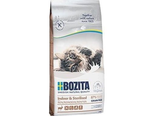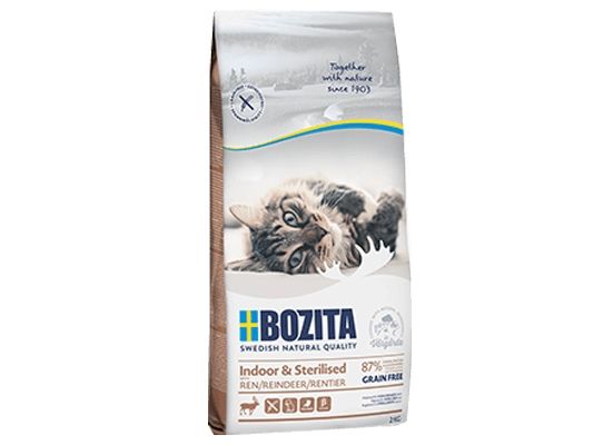 Bozita Indoor & Sterilised Grain-free Reindeer is a complete, balanced food for adult cats. This food is adapted for the lower energy needs of indoor cats and sterilised cats. For this reason, it also works very well for older or overweight cats. Fresh reindeer helps increase the food’s tastiness and digestibility, allowing for an easier takeup of nutrients. In order to promote good gut bacteria, this product contains the prebiotic fibres FOS and MOS. This cat food contains naturally health-enhancing beta-glucans from yeast. It also has an optimal mineral balance (C, P, Mg) and contains high amounts of vitamins and taurin.