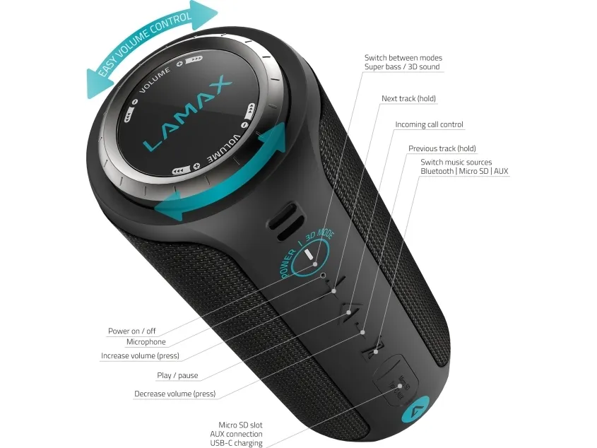Lamax SOUNDER2, 30 W, 115 - 20000 Hz, Ledning & Trådløs, Stereo bærbar høyttaler, Svart, Blå, Cylinder