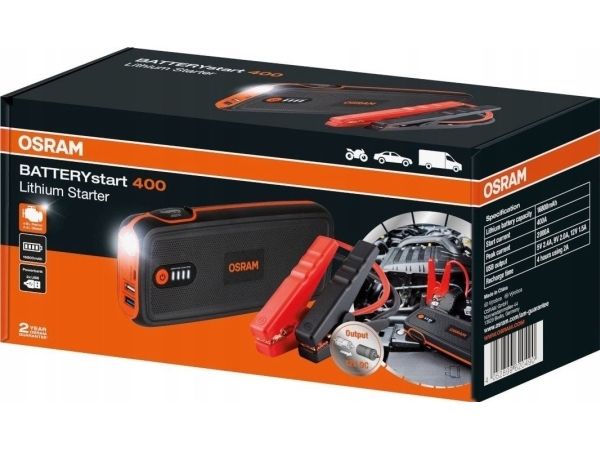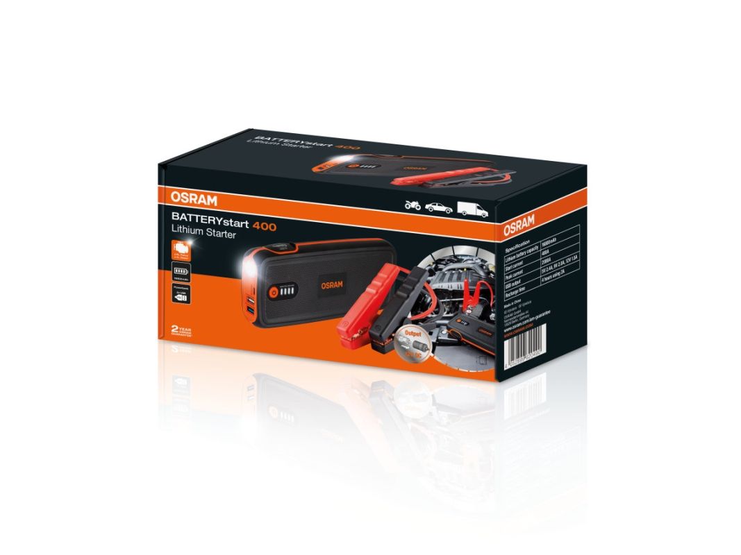OSRAM BATTERYstart 400 kompakte Lithium Cobalt LiCoO2 jumpstarter kan bruges til små til mellemstore 12V køretøjer op til 8L benzinmotorer og 4L dieselmotorer. Selvom BATTERYstart 400 er en kompakt størrelse, går den ikke på kompromis med strømmen. BATTERYstart 400 vejer kun 700g og passer nemt ind i handskerummet på din bil – hvilket gør den nemmere at bruge i en nødsituation.