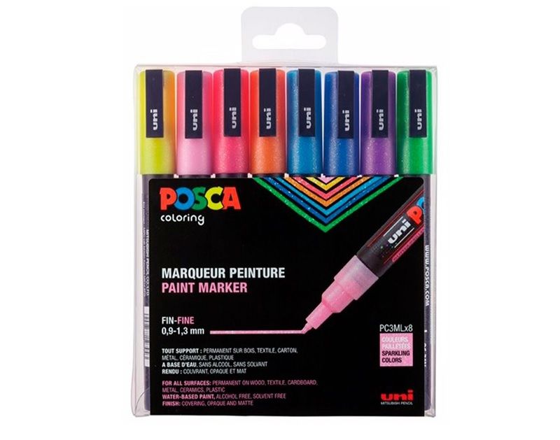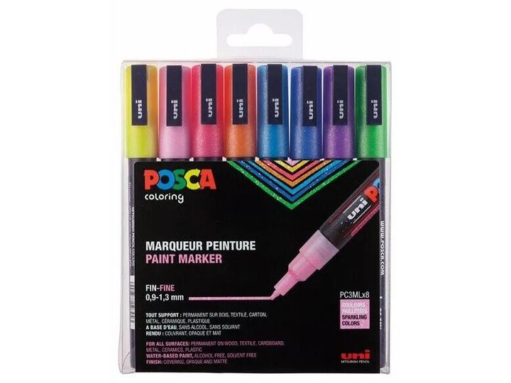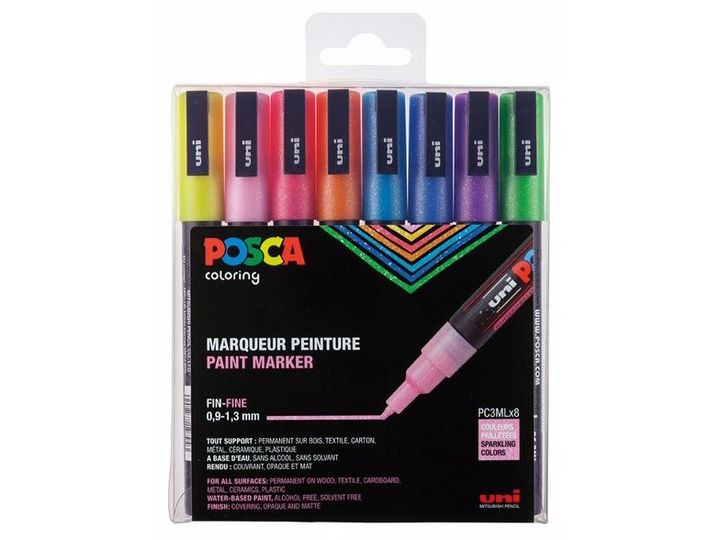 Tusch, assorterede farver, vandbaseret pigmentblæk. Den vandbaserede POSCA marker er en levende alsidig marker, der kan anvendes på mange overflader. I sættet: 8 PC-3M i Glitter farver