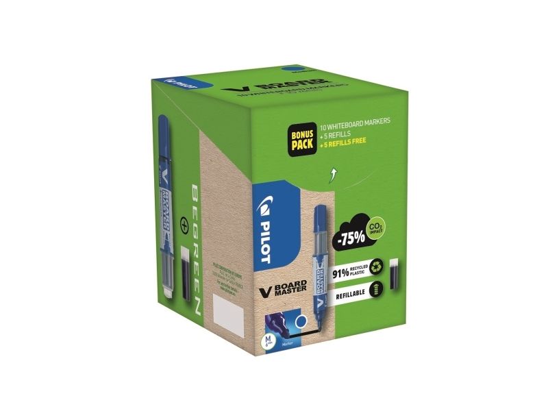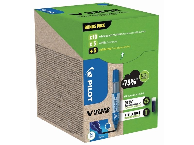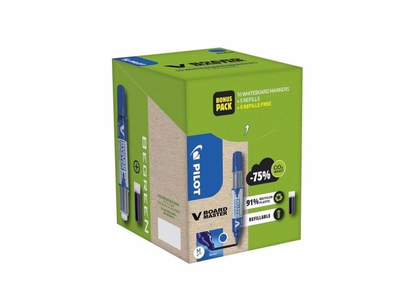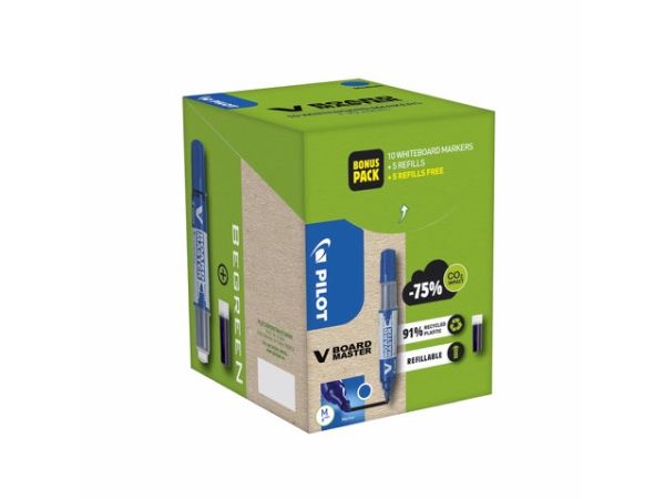 Pilot® V-Board Master Greenpack Økonomisk sampak med whiteboardmarkere og tilhørende refillpatroner.