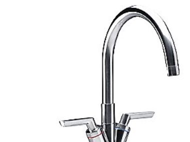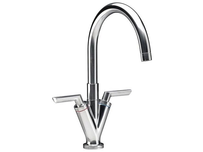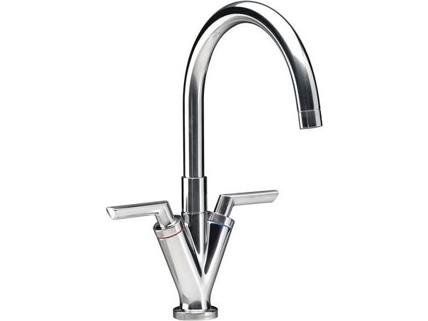 Damixa Venus Køkkenarmatur med høj C-tud. Svingtud med 120 grader begrænsning. Klassisk 2-grebs armatur med keramisk regulering. Reguleringsventil til varmt vand: 745124602Reguleringsventil til koldt vand: 745124601