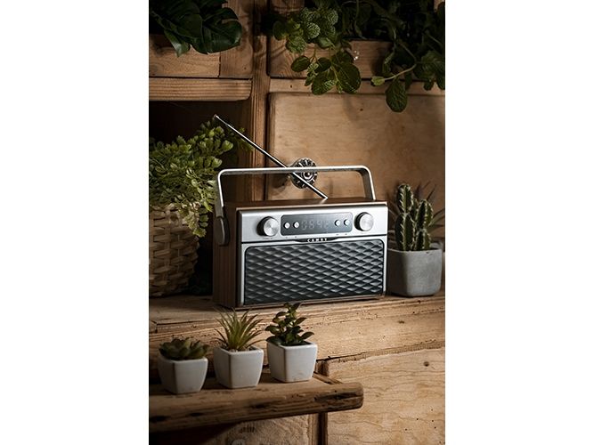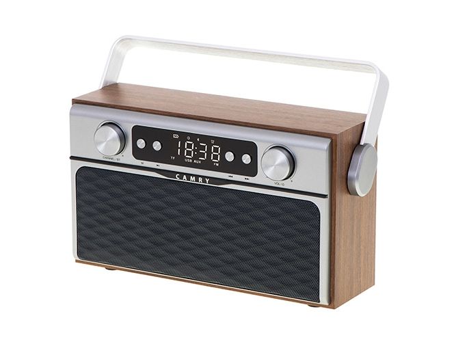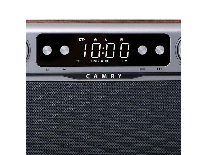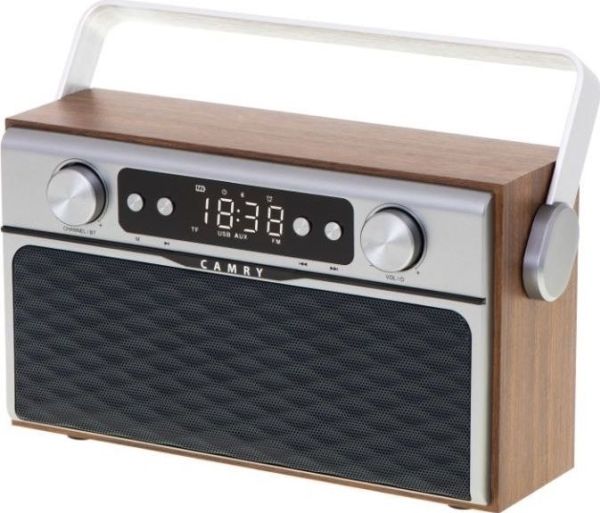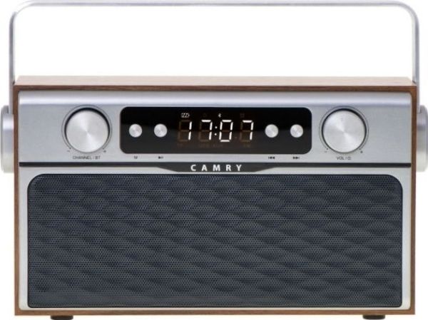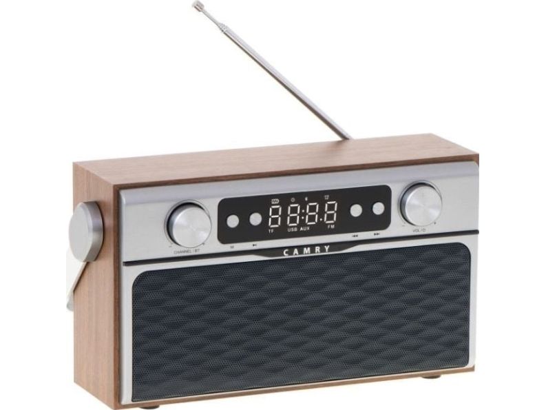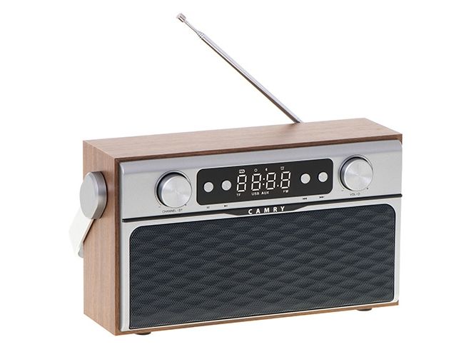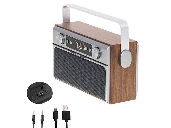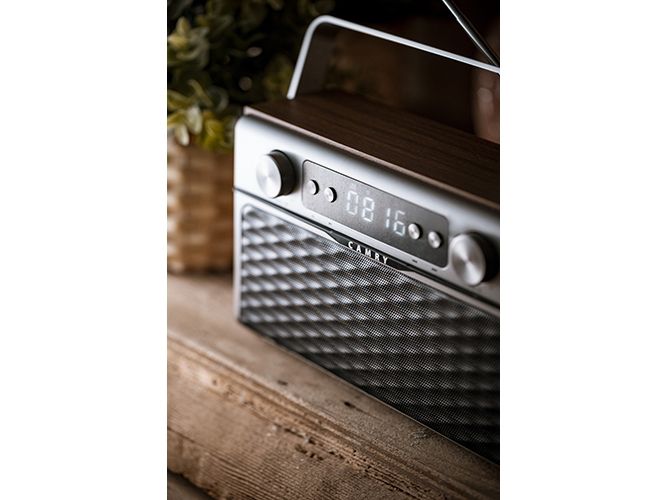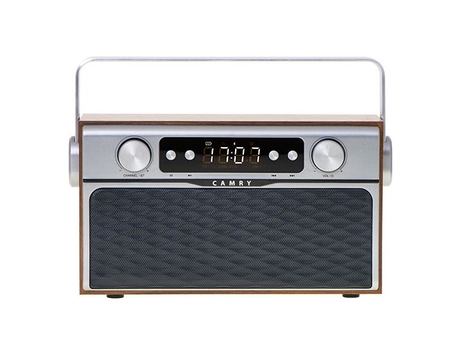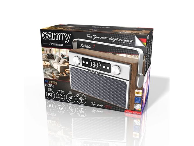 Camry Premium Radio CR 1183. Radio type: Portable, Tuner type: Digital, Supported radio bands: FM. RMS rated power: 16 W. Product colour: Aluminium, Black, Wood, Coloration: Pattern, Volume control: Rotary. Power source: Battery,USB. Package type: Box