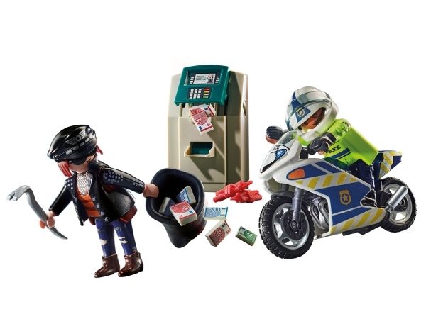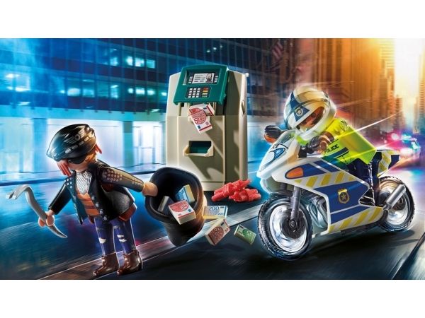 "Et kasseapparat blev smadret, og pengene blev stjålet! Politimotorcyklen er på jagt efter røveren.