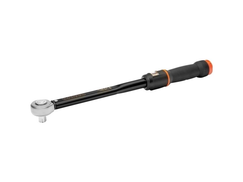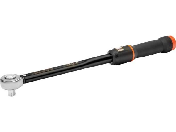 Klik-drejemomentnøgle Robust og præcis mekanisme med over 100.000 cyklusser inden for visningsafvigelse hurtig indstilling af det ønskede drejningsmoment ved hjælp af en drejeknap på enden af grebet inklusive Timestrip®: Visuel visning, så snart en genkalibrering er nødvendig (graduering 3, 6, 9 og 12 måneder) Doppelsskala, der er let at aflæse, i Nm/ft.lb sortiment fra 10 Nm op til 400 Nm eller 7.5 til 300 ft.lb , kan anvendes til venstre- og højrerotation , ± 3% akustisk og mærkbart signal ved opnåelse af drejningsmomentet med 3/8, 1/2 og 3/4 firkantdrev fås markering af grebsmidten ved låst drejeknap er en blå ring synlig inkl. overensstemmelseserklæring testet iht. internationale standarder iht. din en ISO 6789