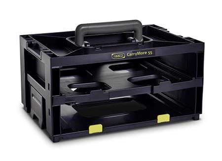 Lager- og transportsystem, til opbevaring af 2 CarryLite 55 4x8 sortimentskufferter. Med ergonomisk bærehåndtag og låsemekanisme til fast forbindelse af flere CarryMore-bæreramme. Stopkanter, som forhindrer, at CarryLite-kufferterne glider ud.
