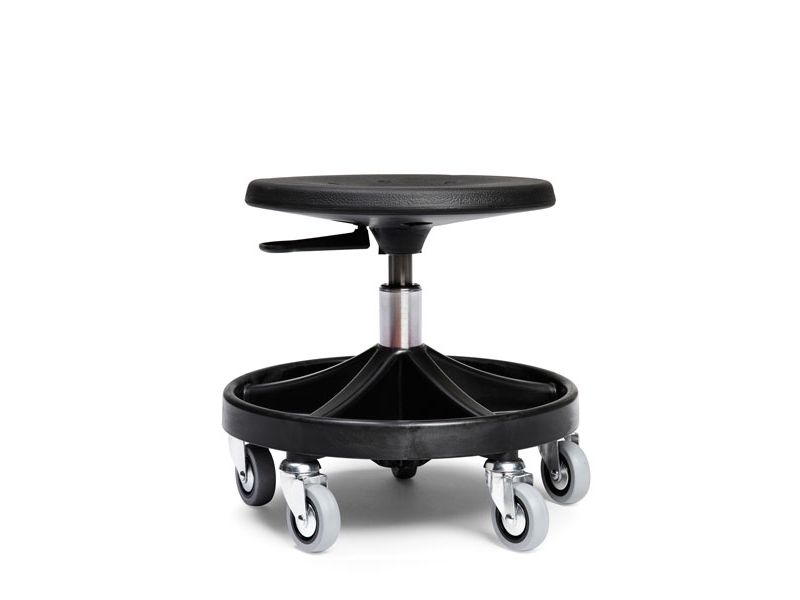 Arbejdsstol All-Round, her med sort understel og 75mm hjul, er en smart og robust arbejdsstol tilpasset dig som har meget arbejde siddende på hug. I stolens understel finder du 5 praktiske rum for opbevaring af det du benytter mest i løbet af en arbejdsdag. Stolen har enkelt, rundt sæde i PU-skum med trinløs justering af siddehøjde 350-470mm. Denne praktiske arbejdsstol er egnet til brug i værksted, ved monteringsarbejde eller også i forbindelse med arbejde i skole og børnehave.