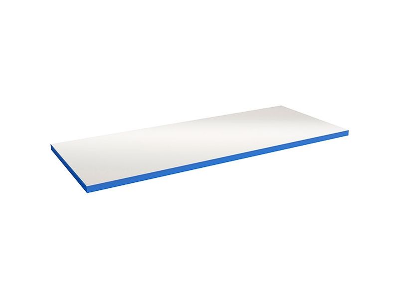 Bordplade til arbejdsbord, bredde 1200 mm og dybde 800 mm. Denne 40 mm tykke bordplade har overside i grå højtrykslaminat (HPL) kantet med blå ABS-kantliste. HPL-overflade giver en bordplade med stor styrke og som er modstandsdygtig mod væsker og kemikalier. Bordpladerne er forborret med bøsninger til vore kraftige benbukke og skuffesektioner, og består af en massiv trækerne og limet træfiberplade.