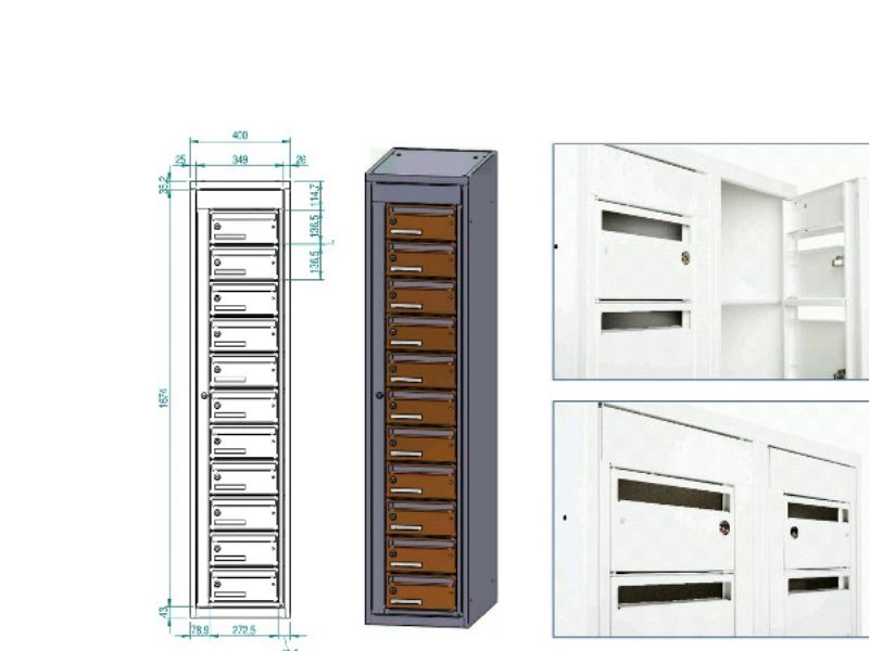 Postsorteringsskabe i lakeret stål Skabe til sortering af dagens post, informationsfordeling m.m. Skabene er med et solidt, helsvejst stålkabinet. Både kabinet og låger er pulverlakeret lysegråt RAL 7035. Skabet kræver ingen montering, kan evt. sættes på et understel (sokkel) og kan tages i brug øjeblikkeligt. Postsorteringsskabene er med cylinderlås, centrallås og lige tag. Kontakt os hvis der ønskes greb for hængelås til den enkelte person.
