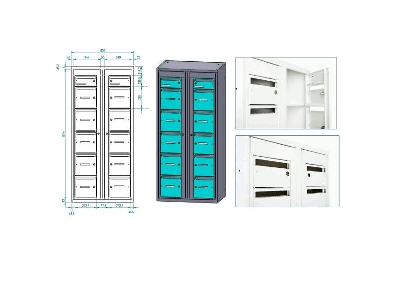 Postsorteringsskabe i lakeret stål Skabe til sortering af dagens post, informationsfordeling m.m. Skabene er med et solidt, helsvejst stålkabinet. Både kabinet og låger er pulverlakeret lysegråt RAL 7035. Skabet kræver ingen montering, kan evt. sættes på et understel (sokkel) og kan tages i brug øjeblikkeligt. Postsorteringsskabene er med cylinderlås, centrallås og lige tag. Kontakt os hvis der ønskes greb for hængelås til den enkelte person.