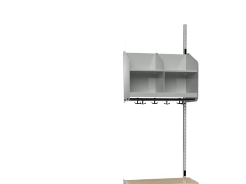 BST kombination C. Garderobe påbygningssektion med 2 pladser og siddebænk. Garderobe- og skohylde med skillevægge i pulverlakeret hvid metal, RAL 9010. Siddebænk med sæde i birk højtrykslaminat. 1 stk. vægskinne og garderobestang med 6 ankerkroge. Pladsbredde 300 mm og totalbredde 615 mm.