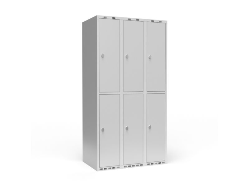 Helsvejst garderobeskab, 3x300 mm med skråt tag. 2 rum i højden, lys grå kabinet (RAL 7035) og antracit dør (RAL 7016), pulverlakeret stålplade. Levereres med færdigmonteret cylinderlås. Indretning er komplet med bøjlestang og 2 stk. ankerkroge. Indbygget ventilation i skabets front, øverst og nederst. Totalmål (b x d x h) 900 x 550 x 1902 mm