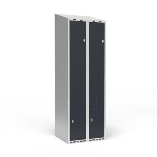 Helsvejst garderobeskab, 2x300 mm med skråt tag. 2-delt søjle med Z-døre, lys grå kabinet (RAL 7035) og antracit dør (RAL 7016), pulverlakeret stålplade.