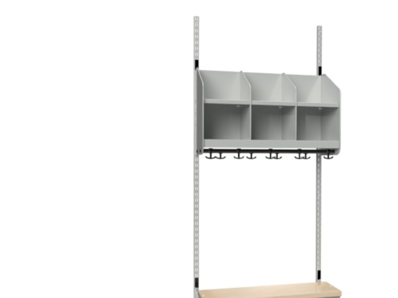 BST kombination C. Garderobe startsektion med 3 pladser og siddebænk. Garderobe- og skohylde med skillevægge i pulverlakeret mørkegrå metal, RAL 7012. Siddebænk med sæde i birk højtrykslaminat. 2 stk. vægskinner og garderobestang med 9 ankerkroge. Pladsbredde 250 mm og totalbredde 764 mm.