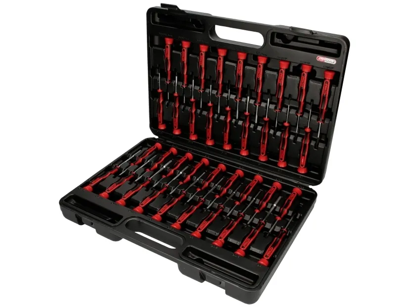 Finmekanik-skruetrækker-sæt, 37-dele Sikker mod elektrostatik. Med hurtigdreje-endekappe. Ergonomisk formet elektronik-skruetrækker. Med tokomponentgreb. Ghærdede klinger. Forkromet med bruneret spids. Klinge af krom/vanadium. I stabil plastkuffert.