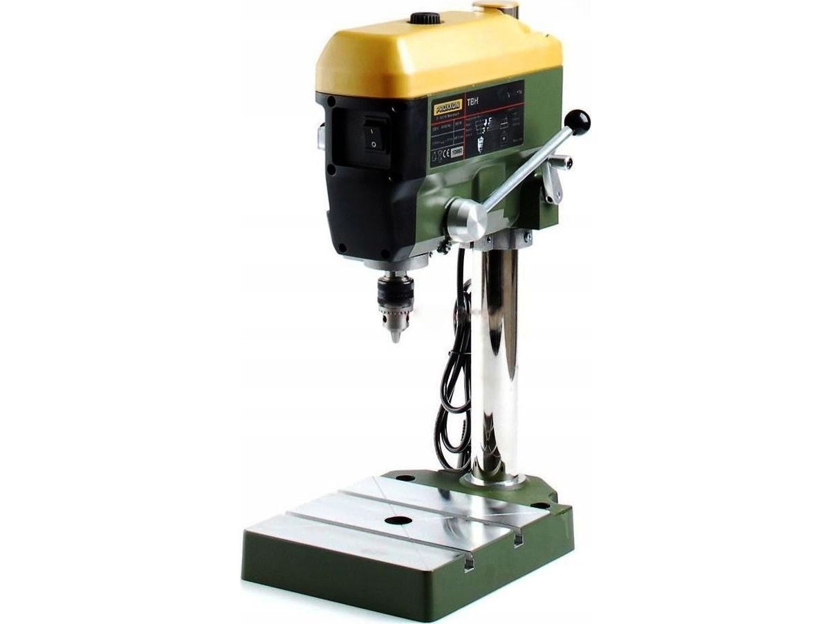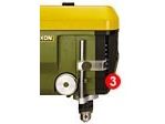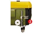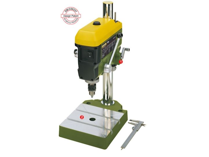 Practical height adjustment via toothed rack with easy to operate crank. Powerful, long-lasting direct current motor. Spindle drive via triple belt pulley with the advantage of roughly 6 times the torque in the lower rotational speed range. Practical drill depth indicator with adjustable limit stop. Drill spindle with precision bearing. Spindle head with 1/2" thread for the corresponding RÖHM chuck (industrial quality). Spindle with additional fit for steel collets NO 28 200. Ideal for jig boring with the compound table KT 150.