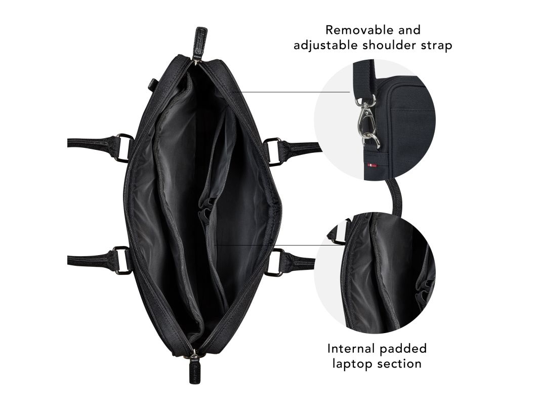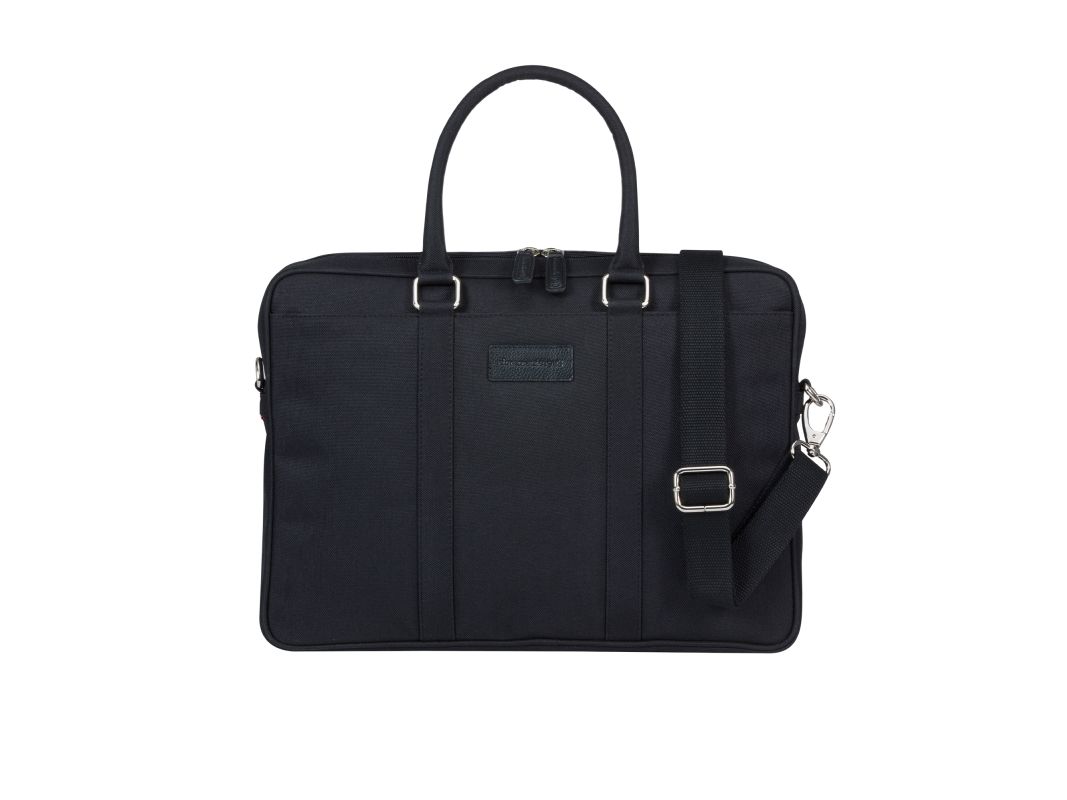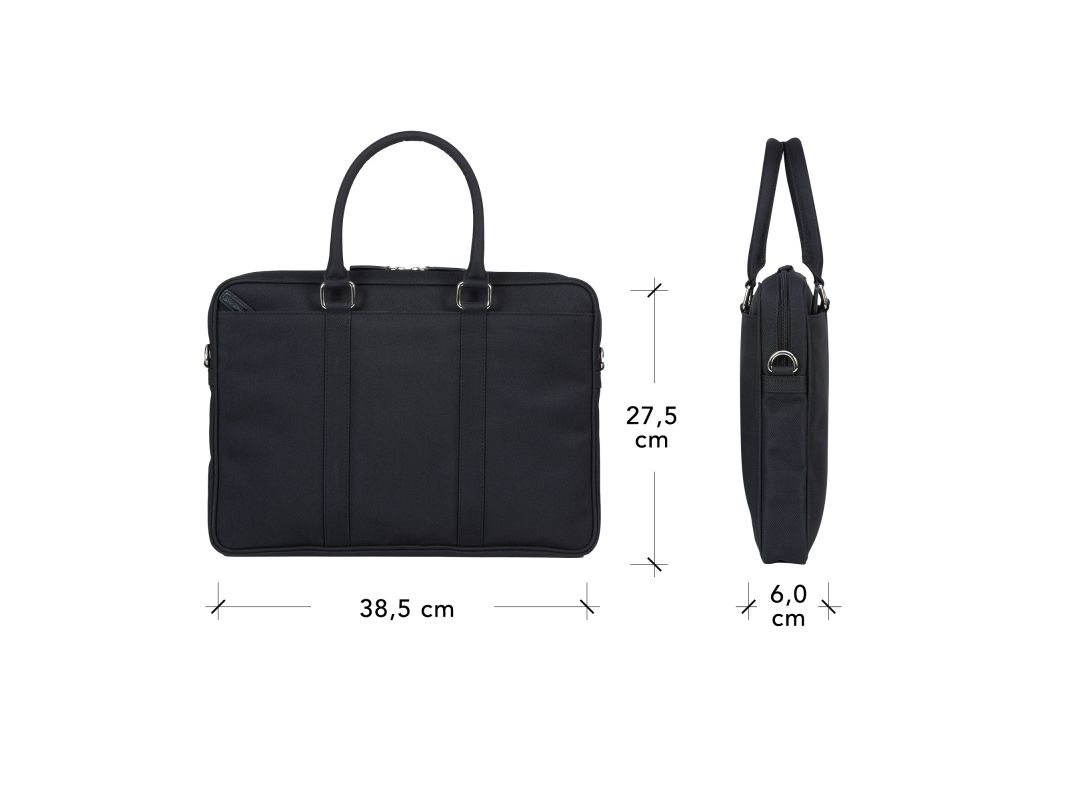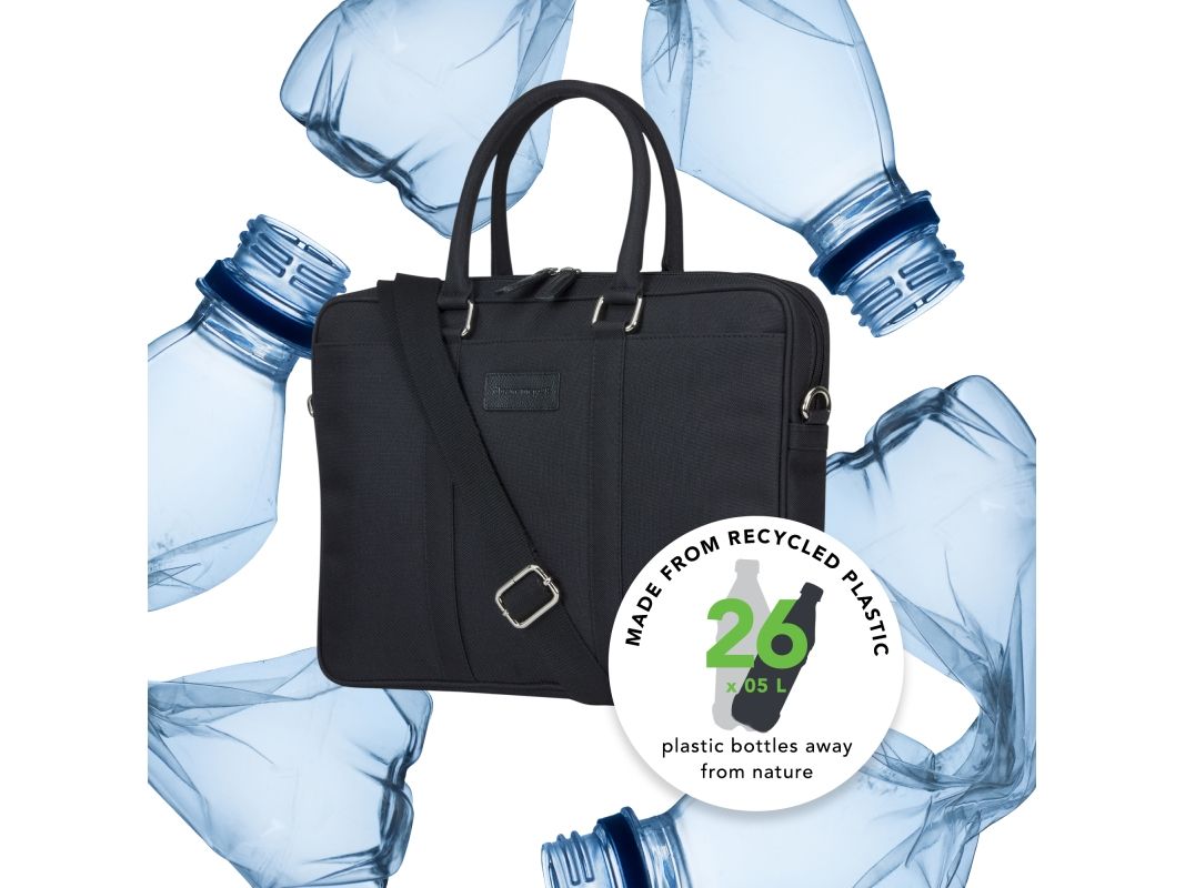 Håndlaget med slitesterkt materiale av resirkulert plast. Dette er en vakker håndlaget veske for bærbare PC-er presentert i en strukturert form. Den kommer med dobbel glidelåslukking, to utvendige lommer (én med glidelås), et innvendig polstret rom for bærbar PC, praktiske avdelinger for å holde eiendeler organisert og en justerbar, avtakbar skulderrem. Vesken har mange funksjoner og er designet med tanke på miljøet av et klimavennlig selskap i Danmark. Den vil derfor beskytte både tingene dine og planeten vår.