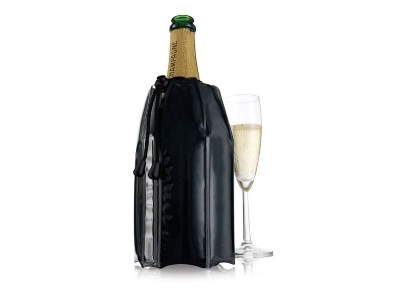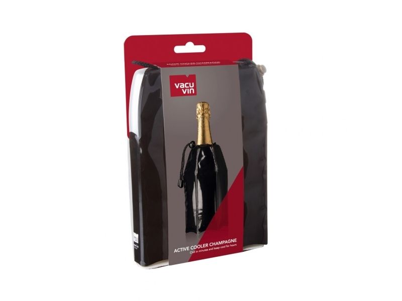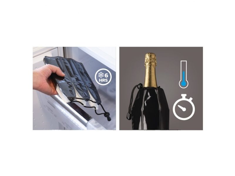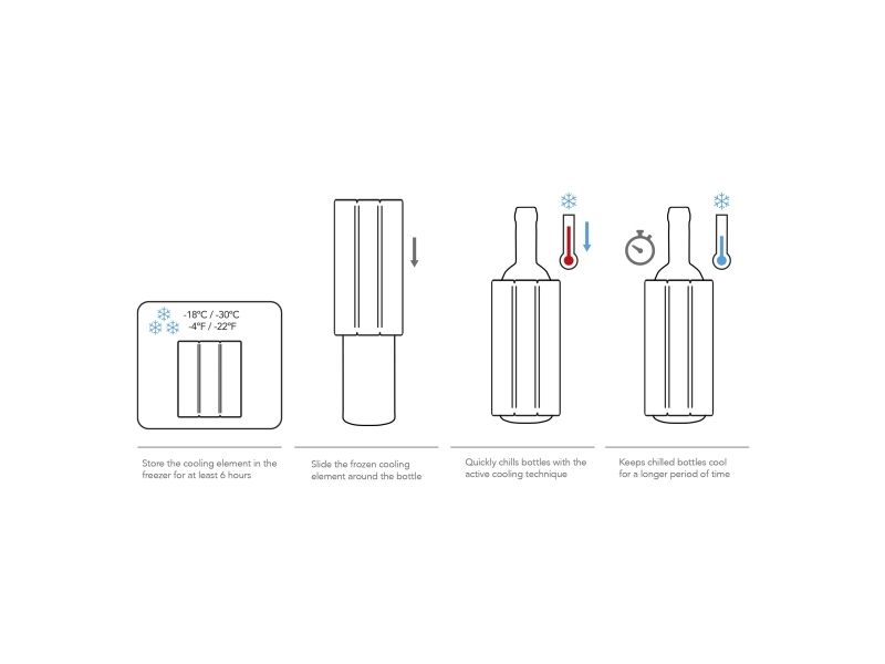 Active Cooler Champagne køler aktivt champagne ved hjælp af et genanvendeligt køleelement. Den fleksible kølehylster har isolerende egenskaber og sidder tæt omkring flasken. Opbevar køleelementet i fryseren for at nyde en kold champagne i længere tid. Passer til de fleste mousserende vinflasker.