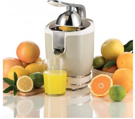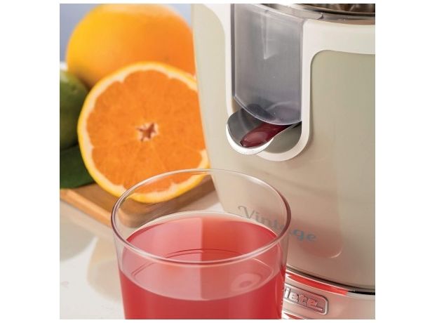 A freshly squeezed orange juice for breakfast is ideal for filling up with vitamin C, mineral salts and energy. With Ariete's Vintage electric juicer you will have a powerful, silent juicer which will at the same time enhance the decor of your kitchen with a retro, shabby chic style typical of Ariete's Vintage line, with a sturdy metal body of robust metal and chromed finishing. It comes with two cones for large and small fruit: the large cone is made of stainless steel and the small cone has a pin to secure even the smallest fruit easily. The Vintage juicer has a pressure lever to squeeze the fruit effortlessly, so it's a professional juicer which you can be sure will keep squeezing till the last drop, thanks to the stainless steel anti-drip spout, designed to avoid wasting juice and ensure that the base surfaces remain spotlessly clean.