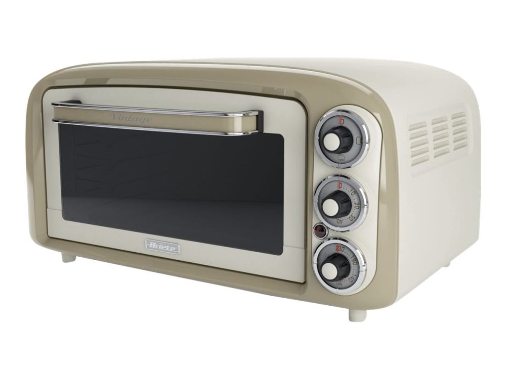 The Ariete 979 Vintage electric oven is the design oven which, with its unique shapes and pastel color, decorates your kitchen. The compact size of this oven makes it easy to find a spot for it in the kitchen. The Vintage electric oven has an 18-liter capacity and allows for the possibility of turning on both elements, or only the top/bottom element separately, for grilling/defrosting. The timer, which can be set for up to 60 minutes, allows you to program cooking times and the thermostat that regulates the internal temperature up to 230 °C allows you to customize your cooking. The Vintage oven is perfect for making pizza thanks to the round cavity at the back of the oven: it can hold a plate with a diameter of up to 30 cm. Ariete makes iconic and functional products: the Vintage Line combines Italian design with the ease of use that is the hallmark of Ariete, Italian company that is a leader in ovens for domestic use.