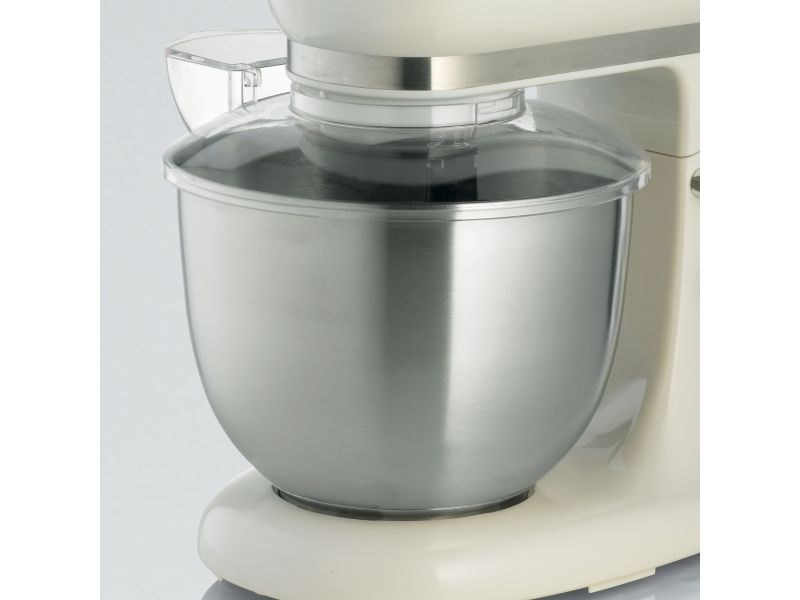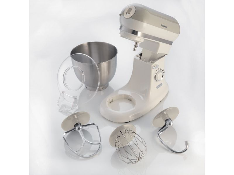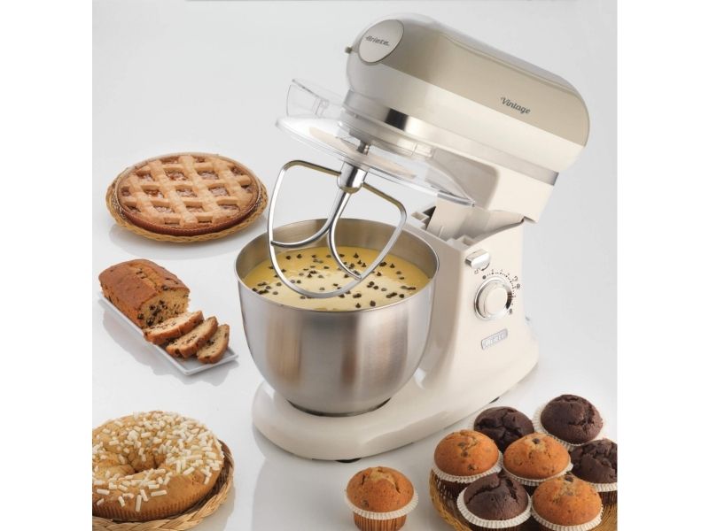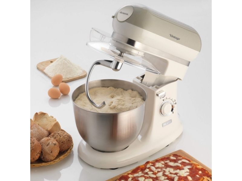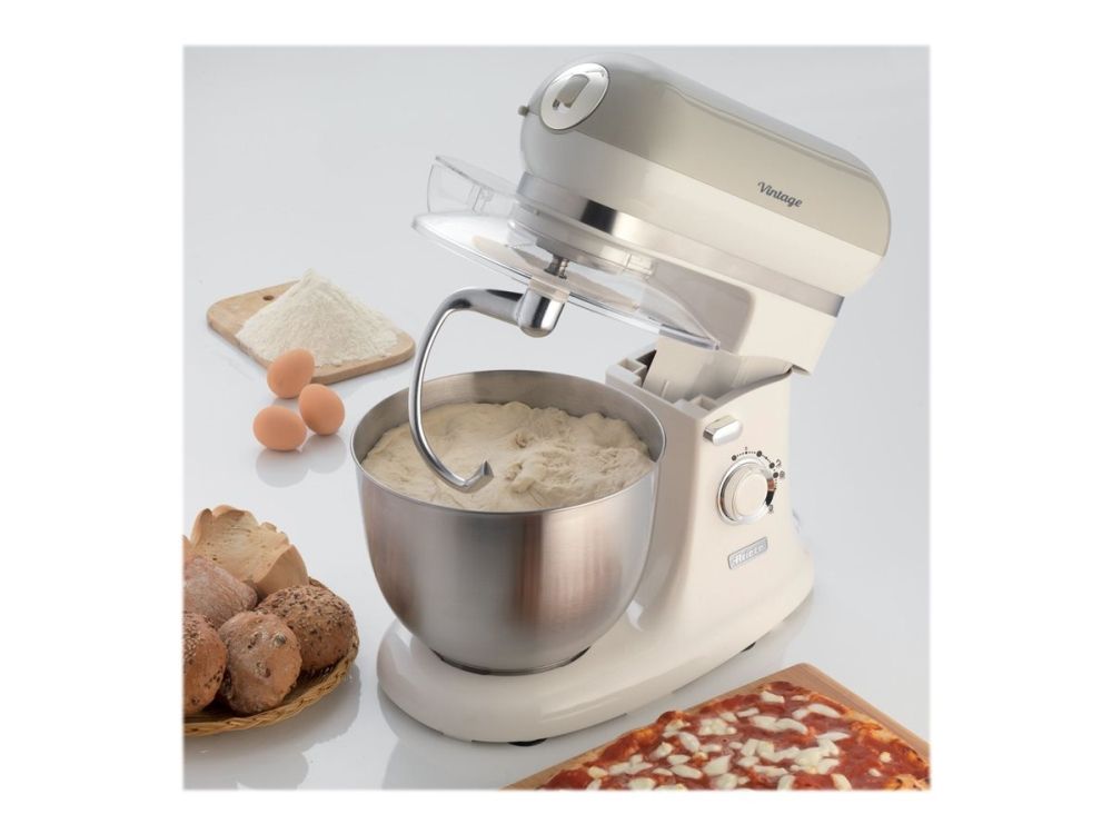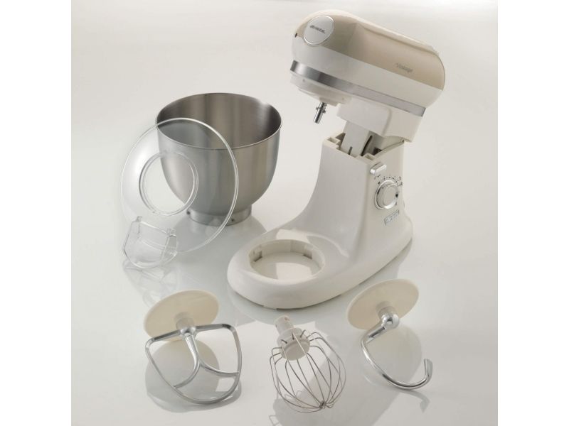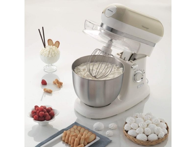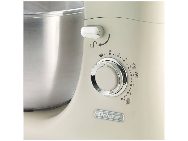 The Ariete 1588 Vintage Mixer is the planetary mixer with an elegant, sophisticated design which combines technology and functionality both for daily meals and for fancy patisserie creations. The motor which reaches 2400W on maximum power, the 7 speeds and the pulse function allow it to work even the stiffest and coarsest doughs. The large 5.5 L stainless steel bowl and the 3 whisks supplied, the dough hook for kneading, the heart-shaped one for mixing and the wire one for beating, allow for a wide range of creations. The non-slip feet and the balance allow the mixer to work at high speed in a secure, stable way, without creating any mess, thanks to the splash guard lid. Ariete makes iconic and functional products: the Vintage line combines Italian design with the ease of use that is the hallmark of Ariete, the leading manufacturer of food preparation products.