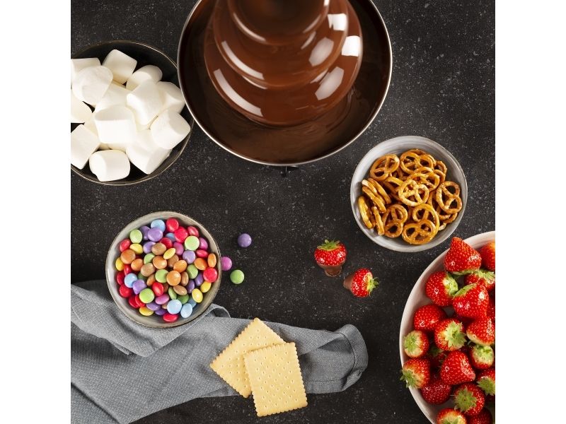 With the Chocolate Fountain XL you can make many chocolate lollipops. Put some strawberries, grapes or pineapple on a skewer, dip it in the chocolate and enjoy a delicious treat. In addition, cookies and marshmallows are also a delicious idea! These are just a few ideas. You can make it as festive as you want.