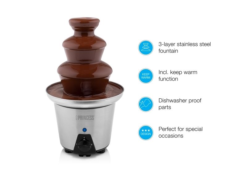 The Princess Chocolate Fountain XL has 3 layers and has a height of 32.5 cm. This allows you to enjoy a festive treat with a large group. Thanks to the handy keep-warm function, the chocolate will not clump and the chocolate will remain liquid. The pump and the temperature can be adjusted separately. So you can determine yourself how quickly the chocolate is pumped around and how hot the chocolate should be. With its 90 watts, the Chocolate Fountain ensures that you do not have to wait long for the chocolate to heat up and become liquid. That way the party can start right away!