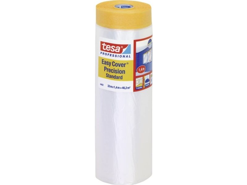 Easy Cover® 4402 er en kombination af en lystransmission, der smyger sig ind til HDPE-folie og tesa® 4344-præcisions-crepe®-standard. Den praktiske 2-i-1 løsning til at dække store og tidsbesparende områder og beskytter i én arbejdsgang. Den er modstandsdygtig over for alle farver og giver en nem afstandbarhed op til 3 måneder indendørs og kortvarigt 1 måned udendørs. Til sikker fastgørelse på glatte og let strukturerede overflader. Den prægede afdækningsfolie forhindrer, at farven løber ud og drypper ned på de flader, der skal beskyttes. Yderst velegnet til et sikkert afdækningsresultat med rene og skarpe farve- og lakkanter.