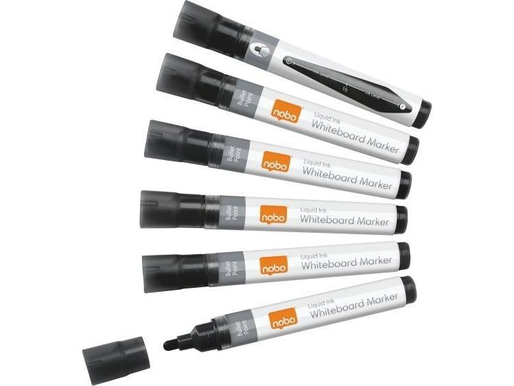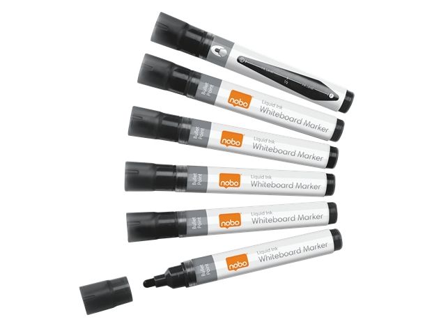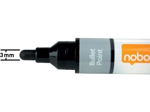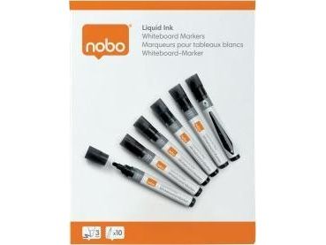 These everyday non-permanent whiteboard markers are highly versatile for use on non-porous surfaces such as whiteboards, glass and enamel. They are fast drying and can be removed easily using a dry cloth. These liquid ink pens also have a handy reservoir window showing ink levels so you never run out at a crucial moment. Available in a choice of colours to meet all your presentation needs; ideal for schools, offices and at home. Pack of 10 dry wipe pens with a bullet tip 3mm for consistent smooth lines. Use with a Nobo whiteboard for optimum performance.