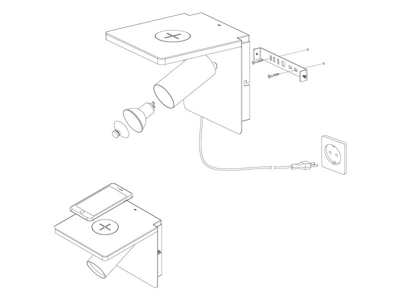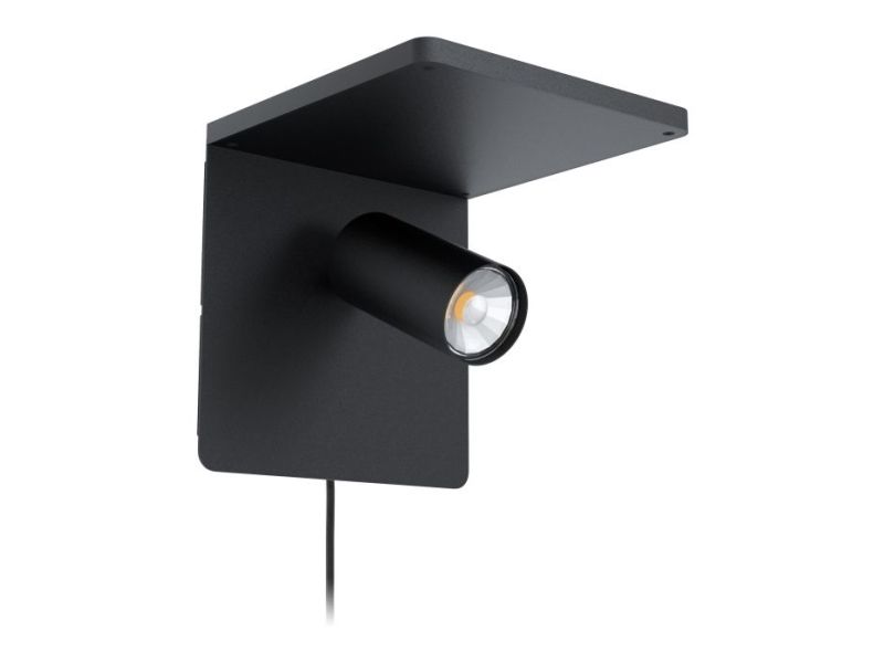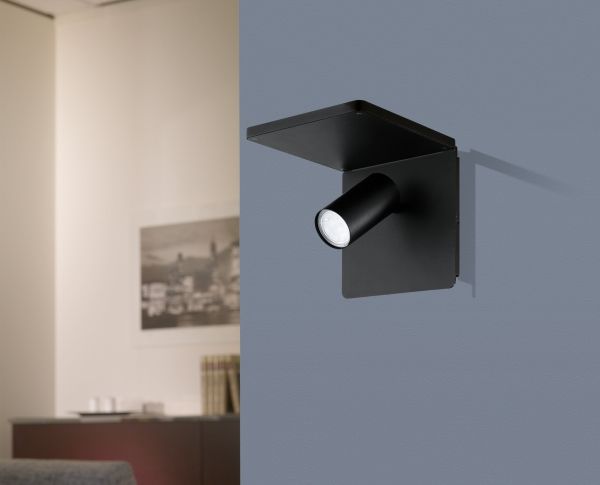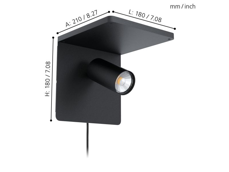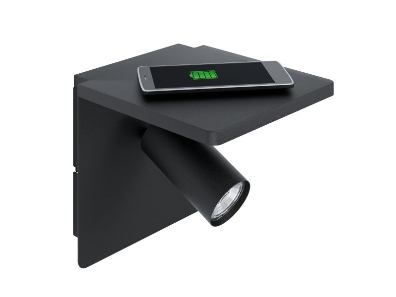 EGLO CIGILE væglampe med spot i sort. Med QI oplader og gennemgangsafbryder. Højde 18 cm, længde 18 cm, dybde 21 cm. GU10, 4,5 watt, 345 lumen, 3000 kelvin. IP20. Dette produkt indeholder en lyskilde med energieffektivitetsklasse: F.