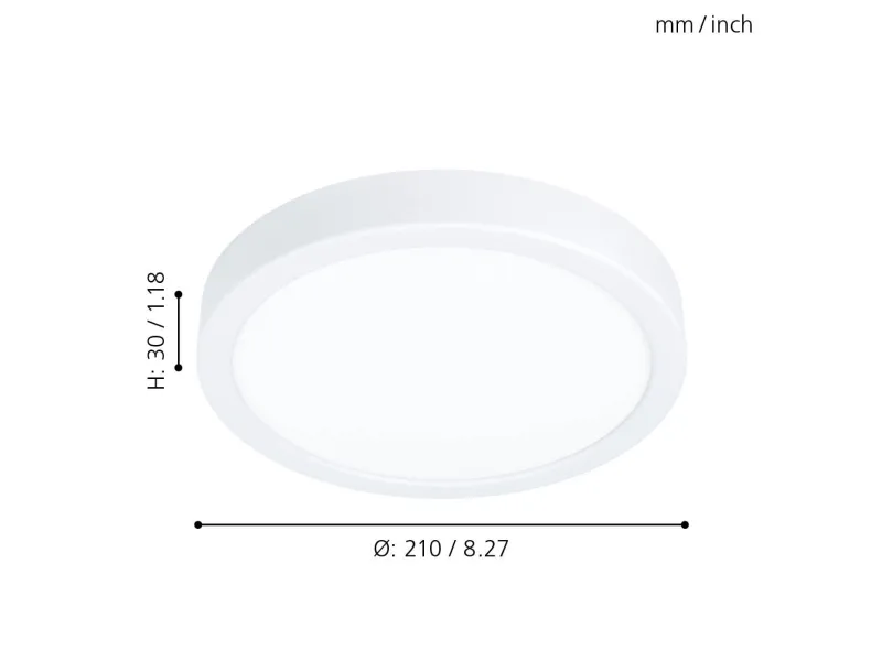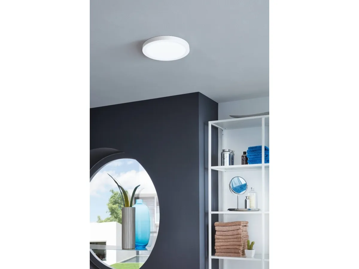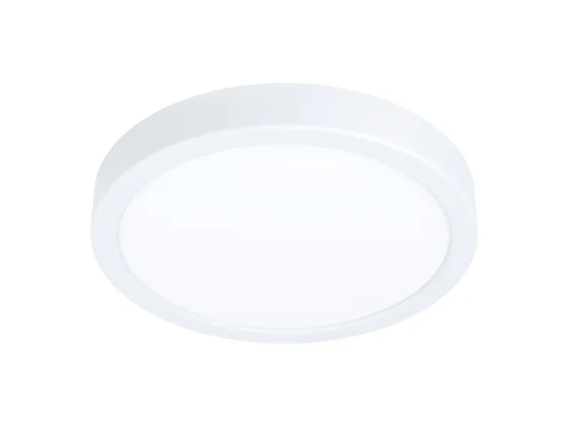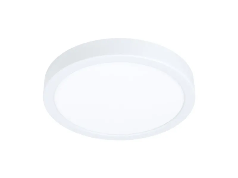 EGLO FUEVA 5 plafond i hvid. Højde 2,8 cm, diameter 21 cm. LED, 17 watt, 2000 lumen, 3000 kelvin. IP20. Dette produkt indeholder en lyskilde med energieffektivitetsklasse: F.