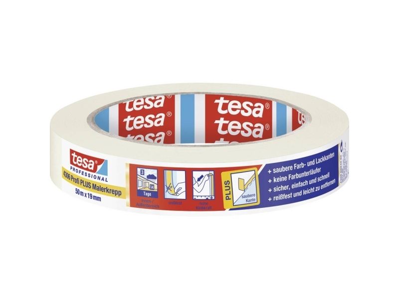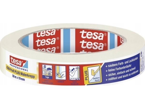 tesa® 4306 Profi Plus malkryds består af en smidig, rivefast og flad specialpapirbærer, udstyret med en moderne, opløsningsmiddelfri klæbemasse af naturgummi, som har en særligt afbalanceret klæbekraft. Afdækningsbåndet udmærker sig ved flade og rene farvekanter uden farveunderløber, særlig let forarbejdning, ved god genpositionerbarhed og nem fjernelse af afstand. Den er fremragende egnet til alle malerianvendelser indendørs, ved en sammenklæningstid på 14 dage, kortvarigt også udendørs maks. op til 3 dage.