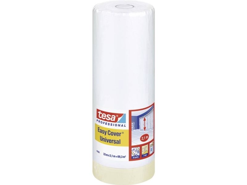 tesa Easy Cover® 4368 universal - malerfolie med integreret malertape tesa Easy Cover® 4368 universal er et praktisk 2-i-1-produkt, som på den ene side dækker store flader med en miljøvenlig PE-folie og kan sættes sammen med let kreppet malertape fra eksempelvis sokkellister eller vinduesrammer. Sådan beskytter du omgivelserne og opnår skarpe farvekanter i kun et, tids- og omkostningsbesparende skridt. Og takket være den overlegne tesa®-klæbekvalitet, skal du ikke bekymre dig om farvedokkende farver, der igen koster tid og penge. Malerafdækningsfolien, det integrerede malertape og din håndværksmæssige snilde er de grundlæggende ingredienser til malerarbejde, som du kan bruge til at overbevise med. Det smarte afdækningssystem egner sig til alt slags arbejde indendørs og kan også anvendes på let strukturerede overflader. Og tesa Easy Cover® 4368 er naturligvis universelt kompatibel med VOC-konforme, dvs. opløsningsmiddelreducerede malinger.