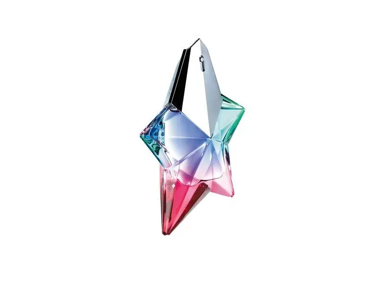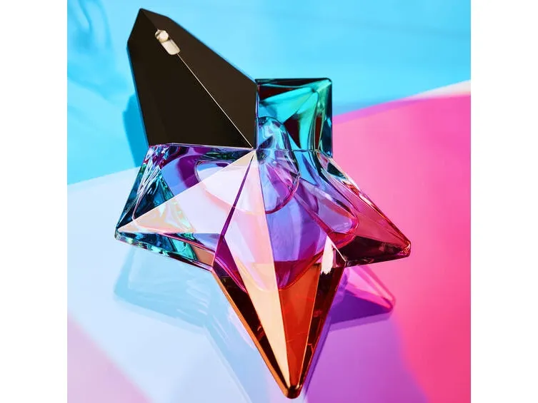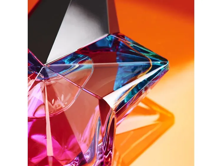 Angel's iconic star is adorned here in festive colors that evoke the warmth and cheerfulness of Brazilian carnivals. A thousand reflections intersect in the colored transparency of the bottle of the Eau de Toilette Angel Eau de Croisière, emerald green marrying pink and azure blue like a sunset over distant seas.