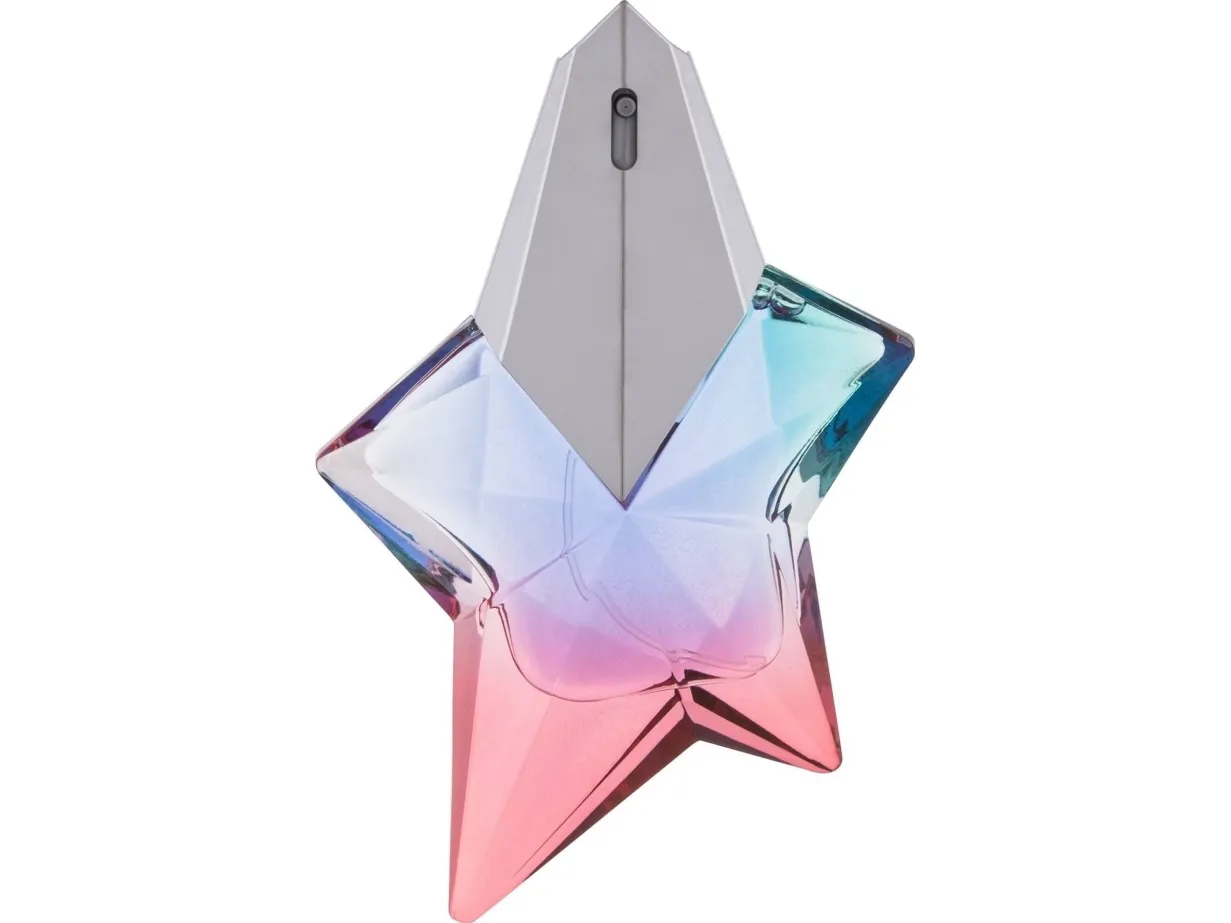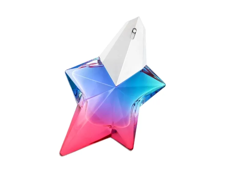 A MUGLER bottle is like a sculpture. The asymmetrical five-pointed star is adorned in exotic colors - azure blue, emerald green, pink - like an airy and desirable summer dress.