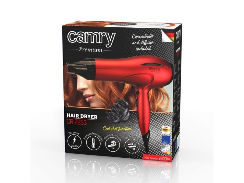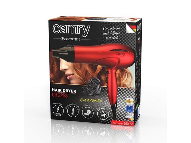 Hair dryer Camry 2253 is a great choice for people who appreciate hair that are well taken care of and who would like to have their hair look stunning. The hair dryer provides you with the possibility to regulate both the speed and the temperature (including cold one). Attached to the device you will find the concentrator and the diffuser that increase the possibilities of making a chosen coiffure and drying the hair. What is more the hair dryer distinguishes itself with its modern design.Camry Premium CR 2253. Product colour: Red, Surface coloration: Monochromatic, Hanging type: Hanging loop. Power: 2400 W, Maximum input power: 2600 W, Minimum power: 2000 W. Weight: 630 g. Quantity per pack: 1 pc(s), Package width: 240 mm, Package depth: 105 mm