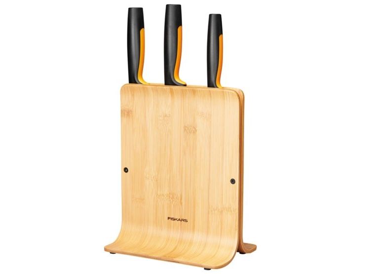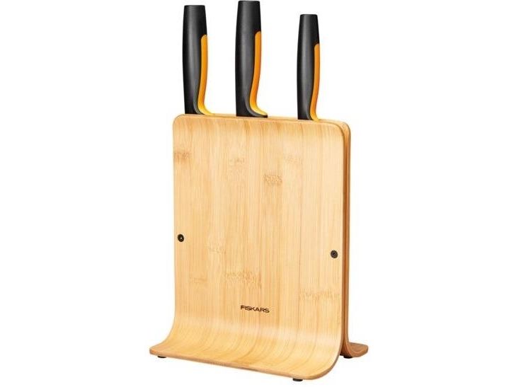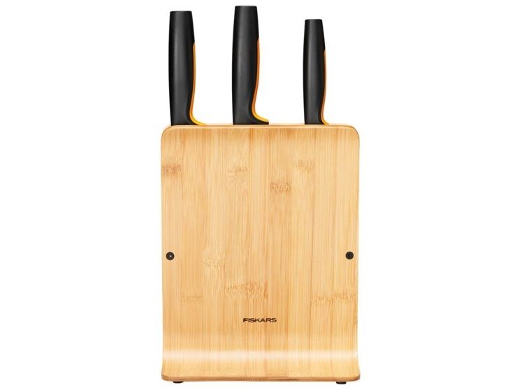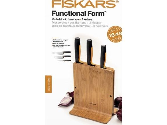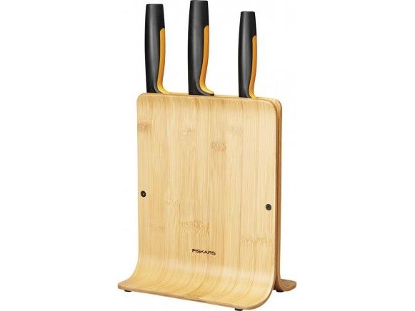 Fiskars Functional Form. Product type: Slot knife block, Blade material: Stainless steel, Material: Bamboo, Plastic, Stainless steel. Blade length: 19.9 cm, Knife 2 blade length: 16 cm, Knife 3 blade length: 11 cm. Number of products included: 4 pc(s)