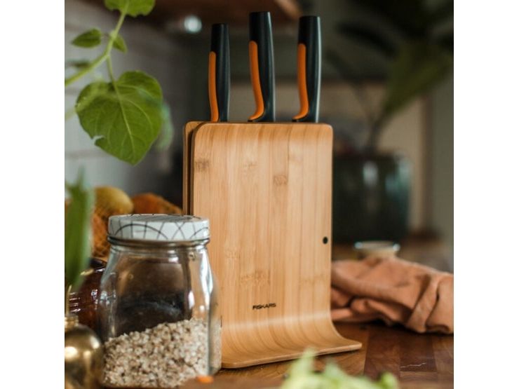 For cooks who appreciate smartly designed, easy-care kitchen tools, Fiskars Functional Form™ Bamboo knife block is an all-around, everyday essential, featuring attractive, compact, upright knife storage with easy-access slots that allow for placement under low-hanging kitchen cabinets. Made of sustainably sourced FSC certified bamboo (FSC C108780) and plastic, this modern knife block includes three of the most commonly used knives: A Large cook’s knife, Santoku knife, and Paring knife. Each of the knives is designed for function, comfort and ease, with durable, Japanese stainless steel blades and ergonomic handles with SoftGrip™ touchpoints and deep finger guards. They’re all dishwasher safe for simple, everyday cleaning. Designed in Finland.