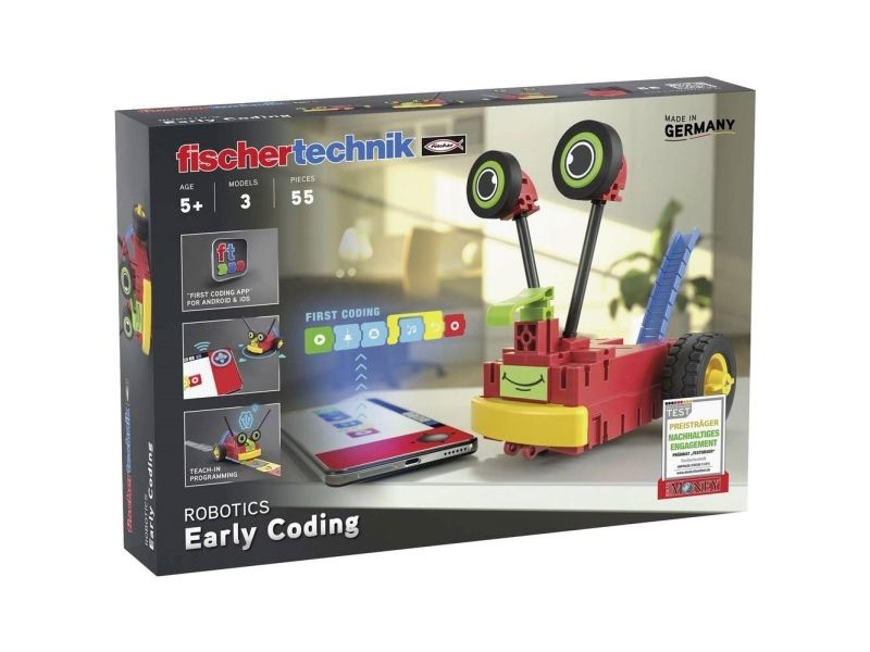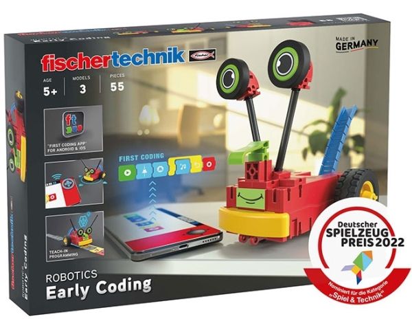 Early Coding Early Coding-chassis bestående af: 2 x motor 2 x trykkontakt Infrarødsensor Velour Batteriholder til 9-V-batteri (batteri medfølger ikke). At gøre fundamentet til den allerede på en legende måde at forstå og forstå på en bæredygtig måde! At skrive et eget program og således vække en robot til live er utroligt spændende og spændende! Denne teknik kan ikke længere undværes i den moderne verden. For også at bringe det seneste emne tættere på er vores fischertechnik Early Coding nøjagtigt det rigtige. De færdige komponenter viser dig vejen ind i informationsteknologien, og robotteknik bliver til en masse sjov og fornøjelse. De to motorer og sensorer er fast og færdigintegrerede i en Block. det vil sige, at den tændes, forbindes med den mobile enhed via Bluetooth og at den er i gang! Det enkle grafiske programmeringsmiljø med de præfabrikerede eksempler er opbygget alderssvarende - perfekt til introduktion til robotikkens verden! Det første at oprette sit eget program er med softwaren også legende let muligt.