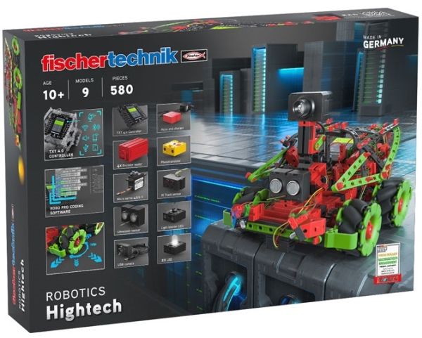 Program like a professional with fischertechnik Robotics Hightech! 9 exciting models are just waiting to be built and programmed. The beginner models offer an easy to understand glimpse of the world of robotics and programming. More advanced students can get started with the high-end models, like the painting robot or shooting robot. One highlight of this building set are the omniwheels, which are operated by four encoder motors and allow the robot to move in any direction. Our camera with image processing is also included, and allows the football robot, for example, to identify a ball – he shoots, he scores! The new fischertechnik TXT 4.0 Controller works with new ROBO Pro Coding programming software to offer a variety of new features. In addition to graphic programming in the Blockly library, it now also allows for programming using Python. The software is not dependent on any specific OS, and can be used on mobile devices. The building set includes a servo motor, an infrared track sensor and an ultrasound distance sensor as well.