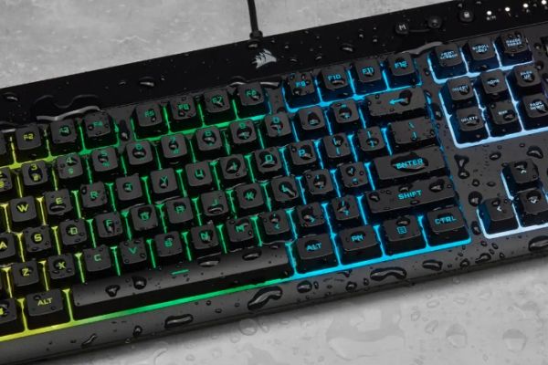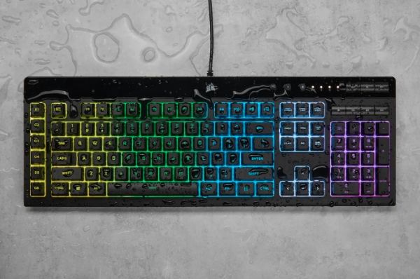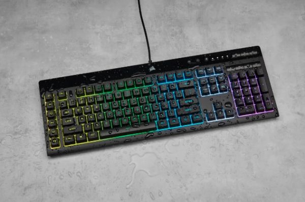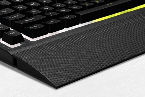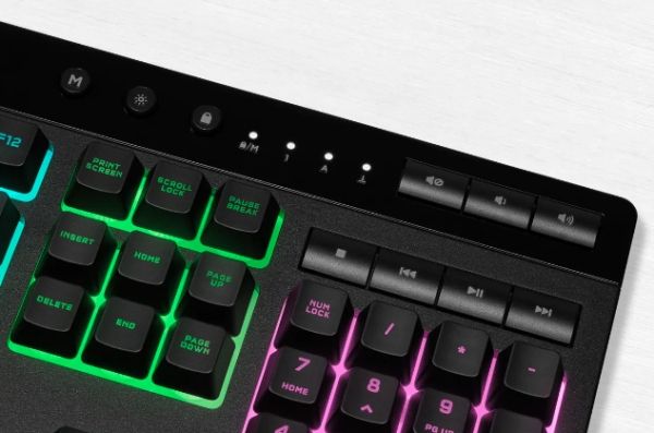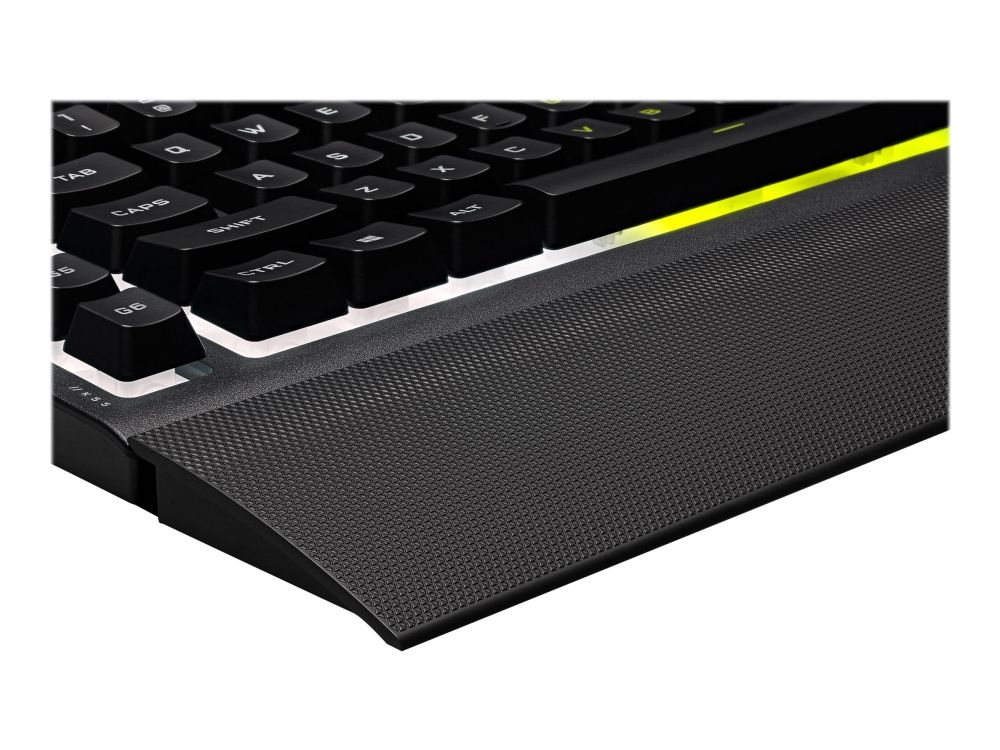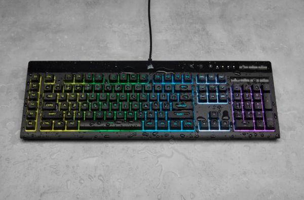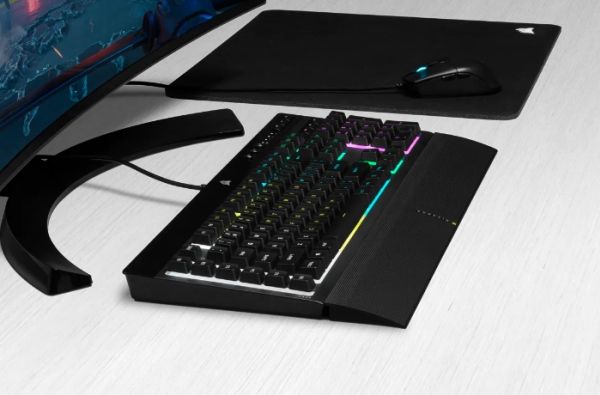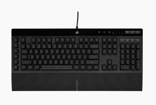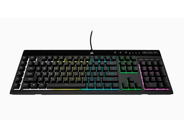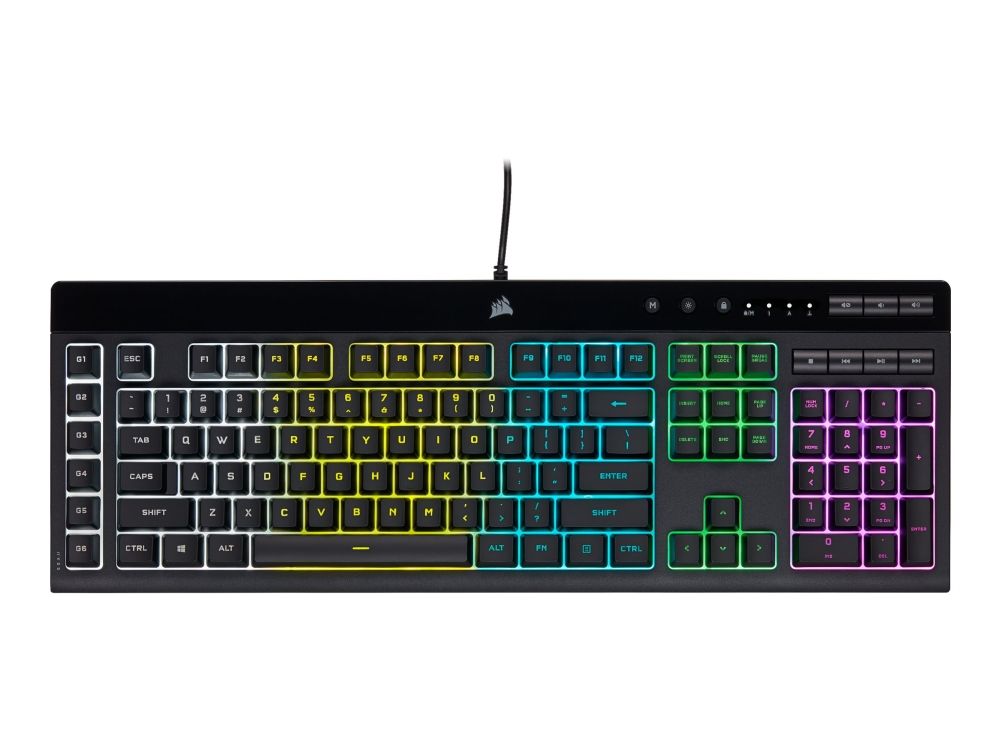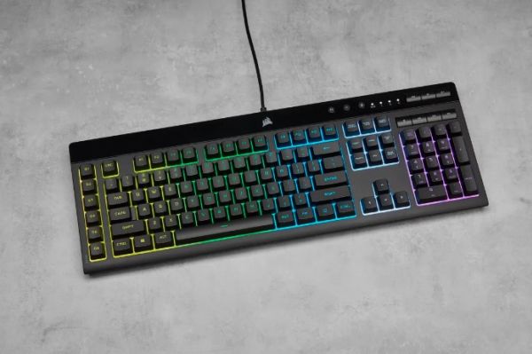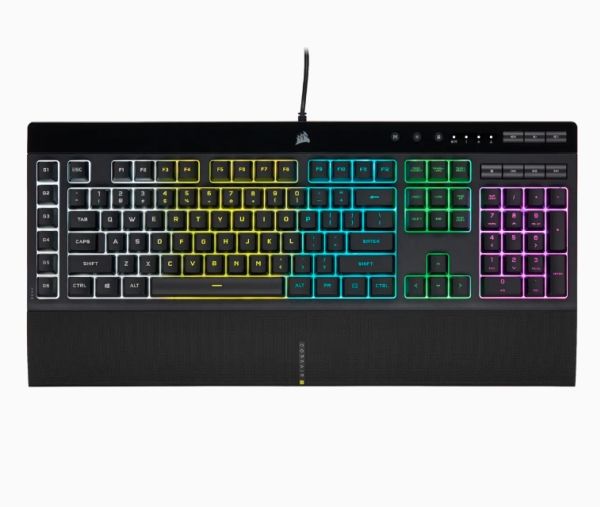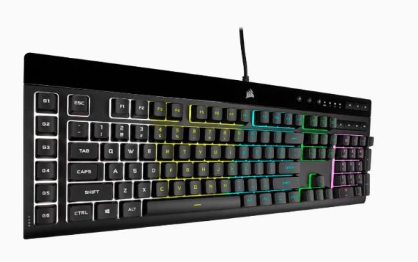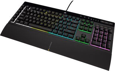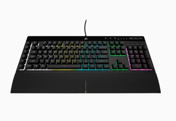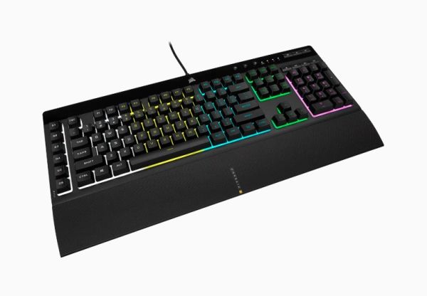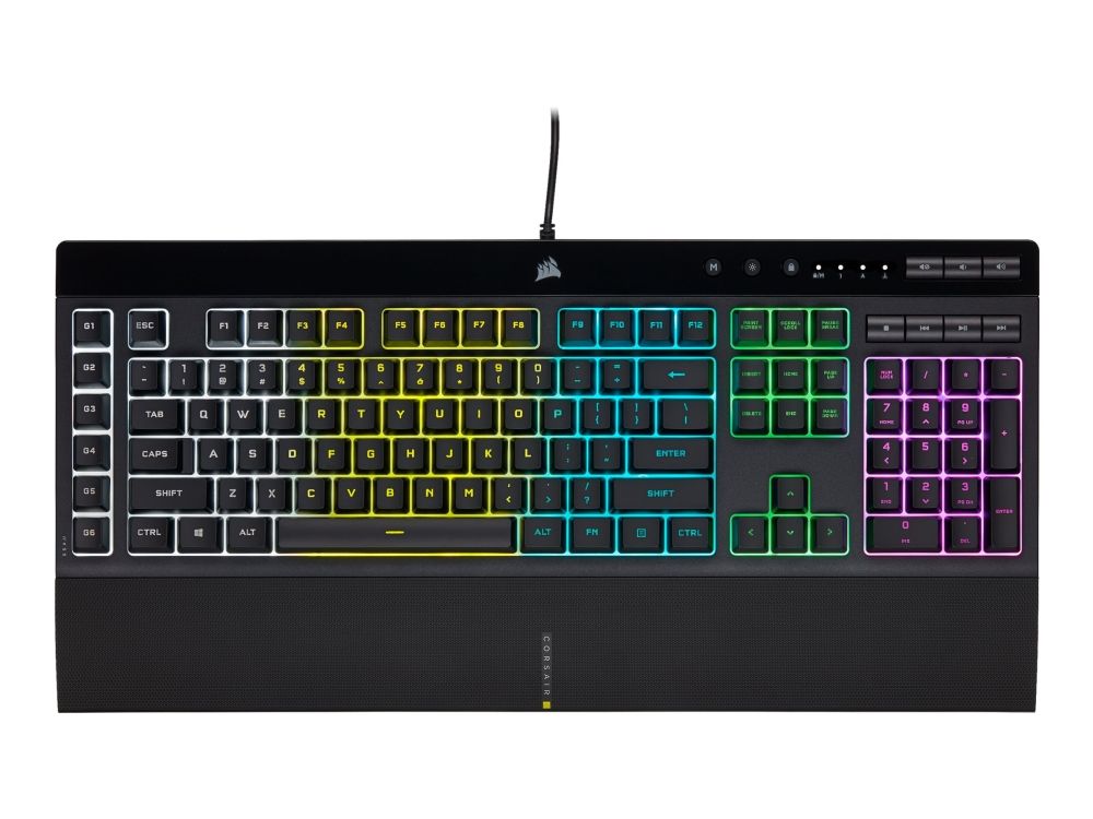 The CORSAIR K55 RGB Gaming keyboard features dynamic three-zone RGB backlighting, six dedicated macro keys with Elgato Stream Deck software integration, IP42 dust and spill resistance, and a detachable palm rest.