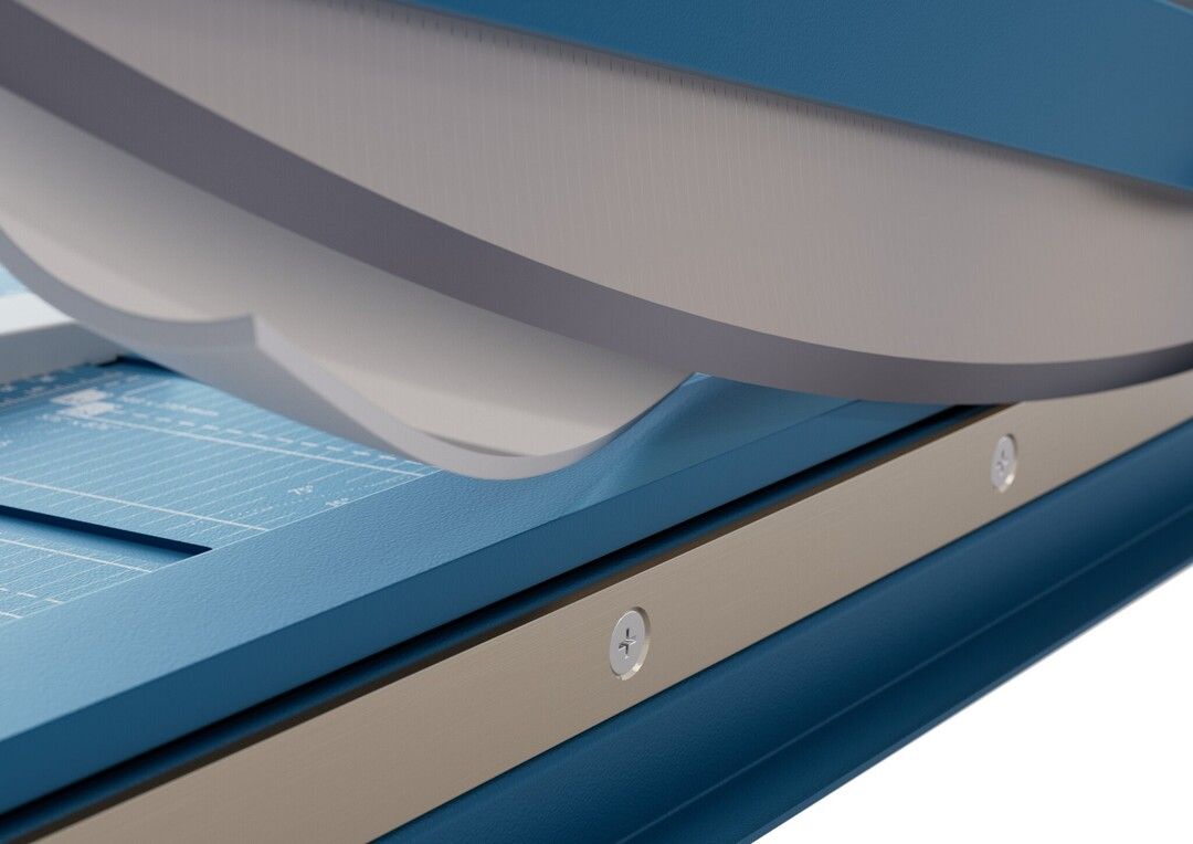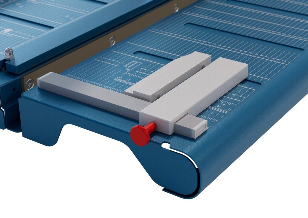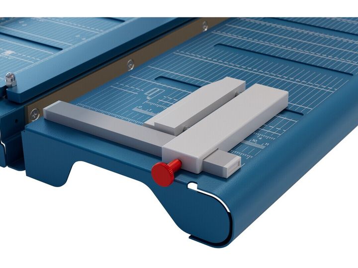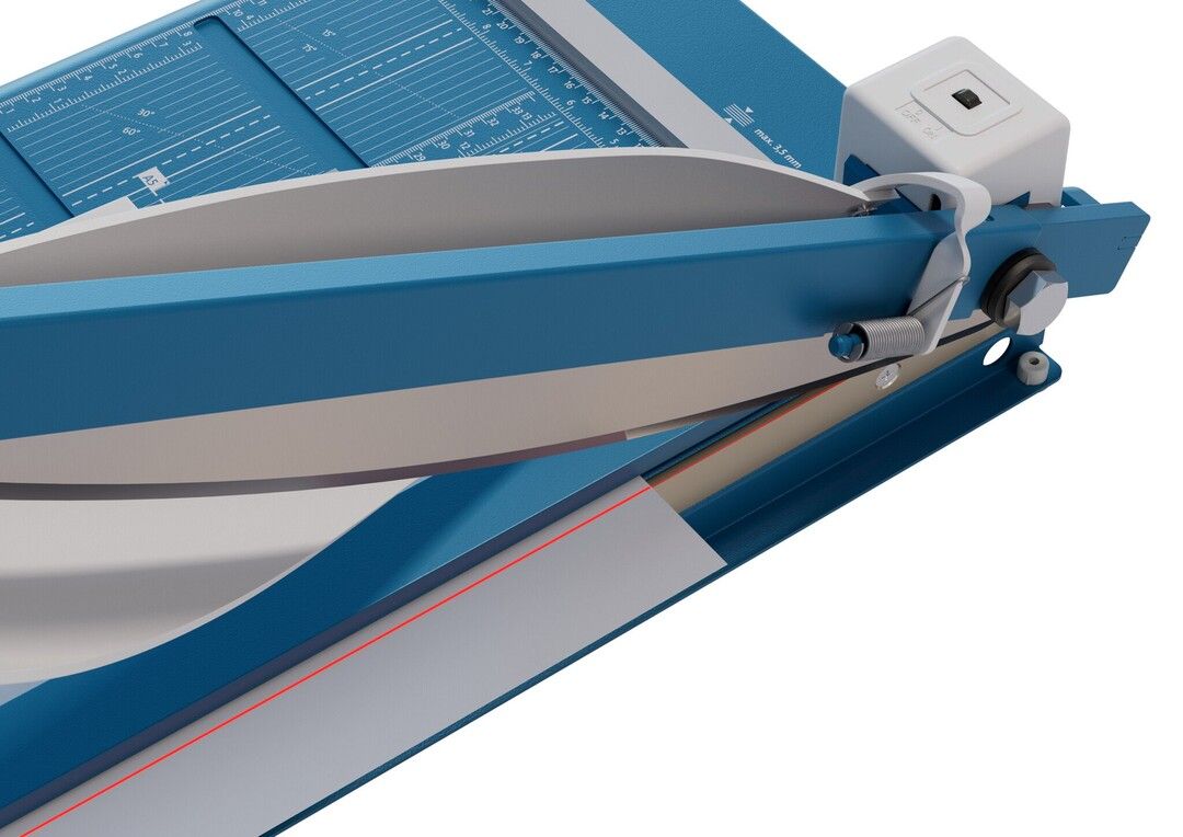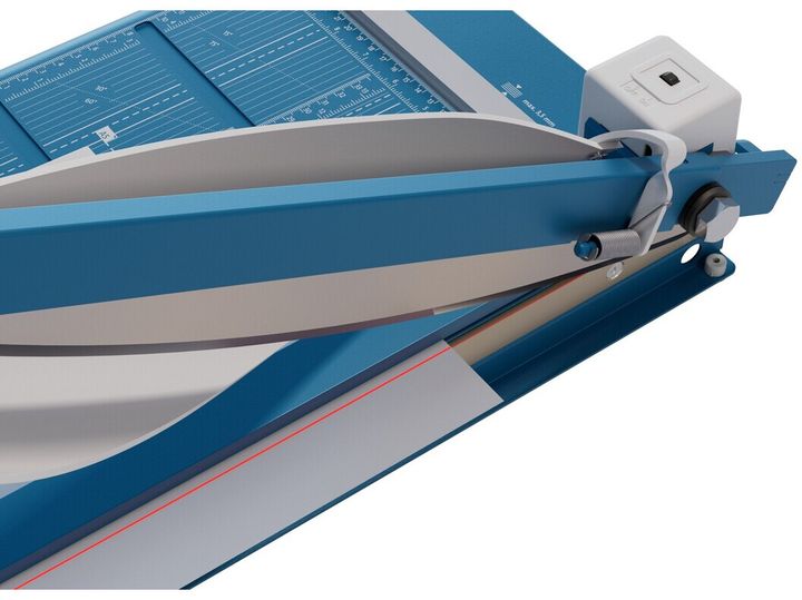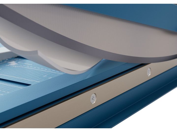 - User-friendly guillotine for professional use - Sturdy solid metal table with rounded edges and non-slip rubber feet - Practical recessed grips for safe handling - Practical format lines on the table - Ergonomically shaped handle - Screw-mounted, ground upper blade - Screw-mounted, ground lower blade - High-quality, re-sharpenable blades made of Solingen steel - Sturdy, solid-steel blade holder - Reliable automatic safety guard - Automatic, de-selectable clamping - Two scale bars with mm scale - Adjustable backstop in guide channels - Narrow guide channels in the table prevent individual sheets from slipping through - Front table with magnetic connector - Precision narrow-strip cutting device - Precision laser beam line indication