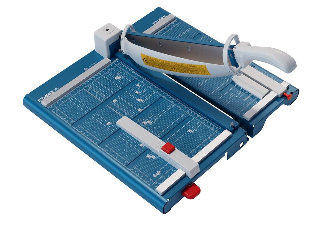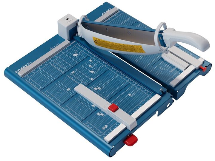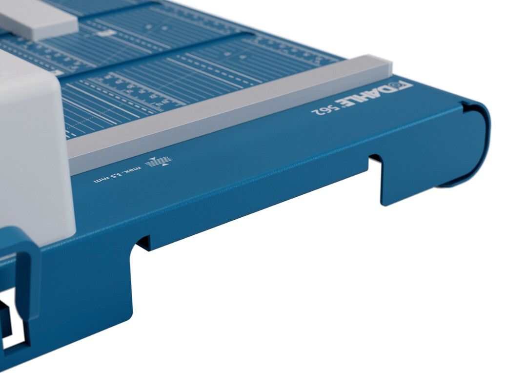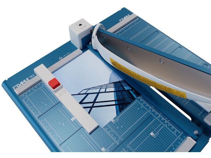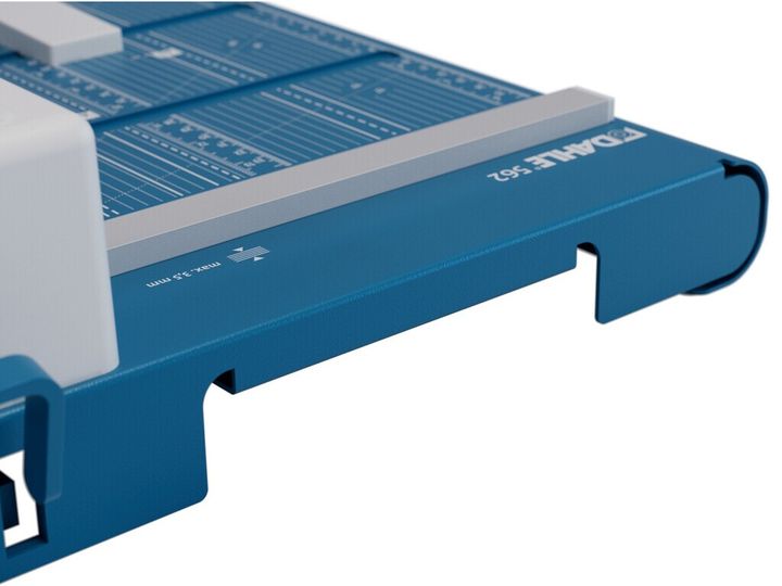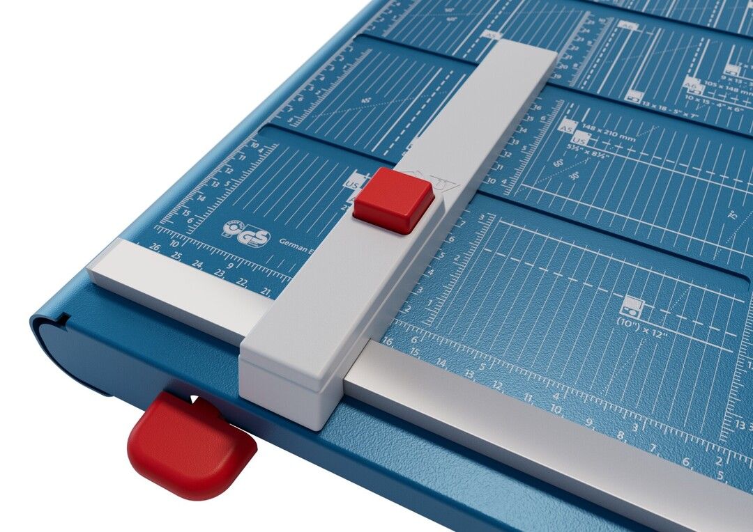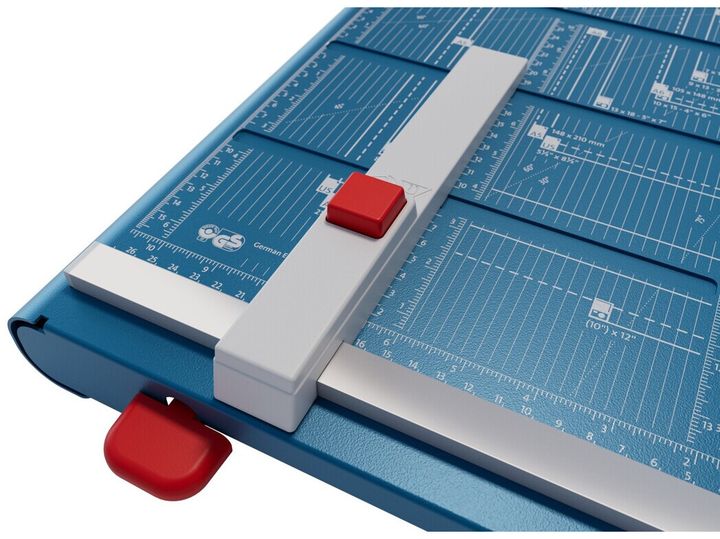 - User-friendly guillotine for professional use - Sturdy solid metal table with rounded edges and non-slip rubber feet - Practical recessed grips for safe handling - Practical format lines on the table - Ergonomically shaped handle - Screw-mounted, ground upper blade - Screw-mounted, ground lower blade - High-quality, re-sharpenable blades made of Solingen steel - Sturdy, solid-steel blade holder - Reliable automatic safety guard - Automatic, de-selectable clamping - Two scale bars with mm scale - Adjustable backstop in guide channels - Narrow guide channels in the table prevent individual sheets from slipping through - Front table with magnetic connector - Precision narrow-strip cutting device - Precision laser beam line indication