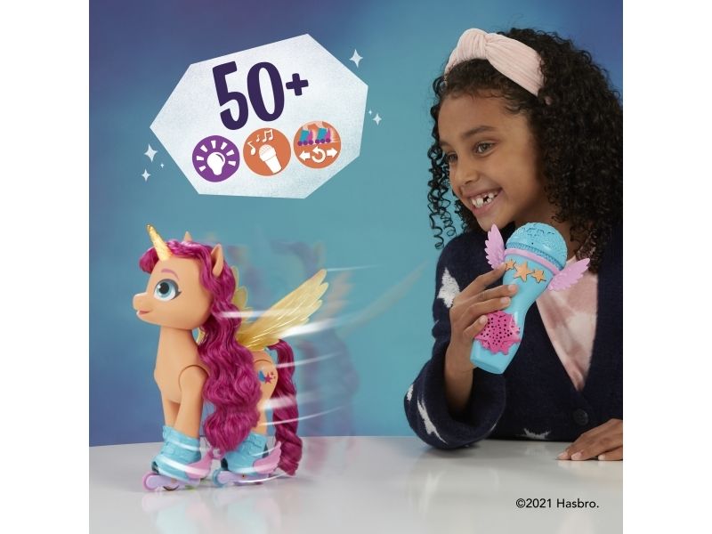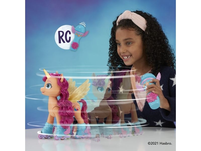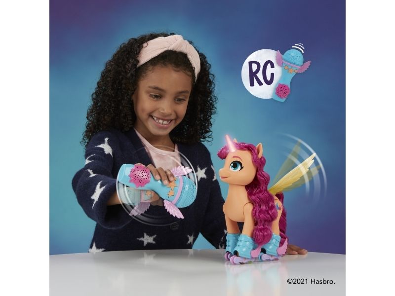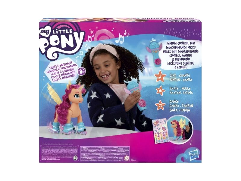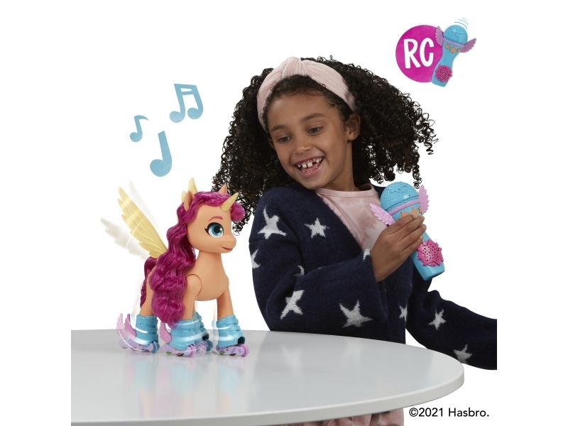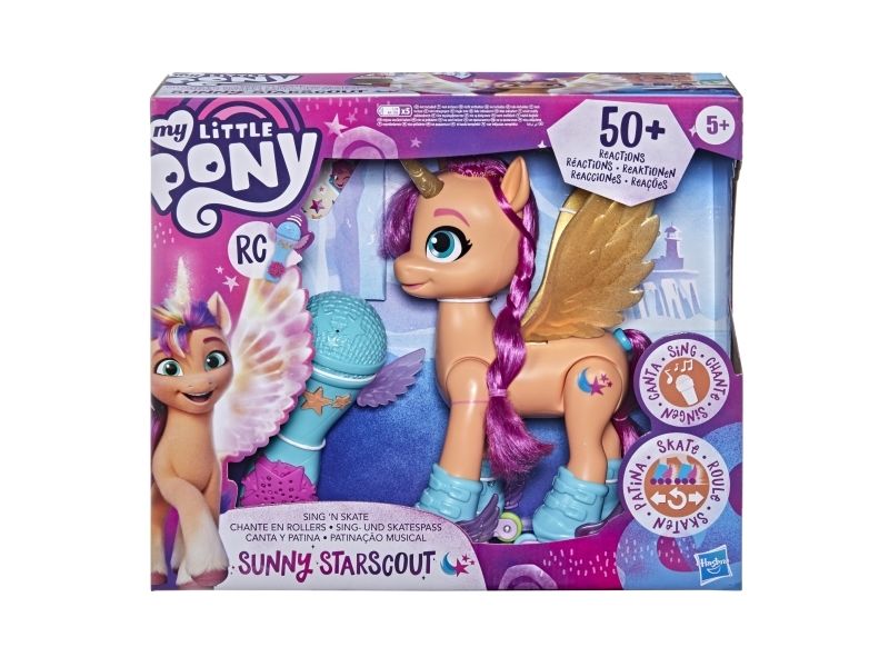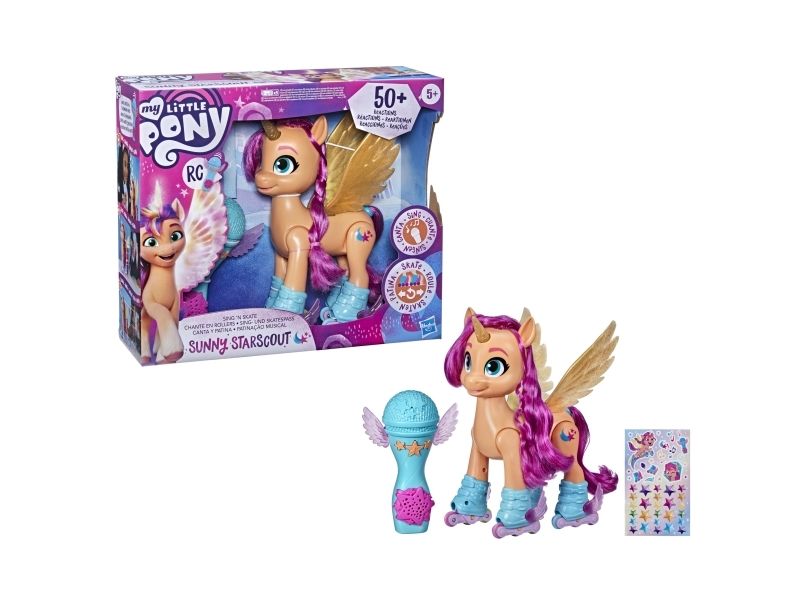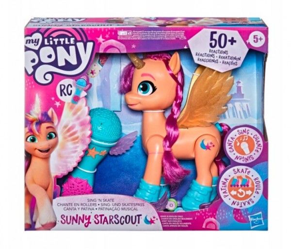 Get to know Sunny Starscout: an adventurous pony from Maretime Bay! Sing 'N Skate Sunny Starscout is an interactive pony figure that kids can control. Comes with a cordless microphone that can be used for singing or as a remote control. Use the buttons on the microphone to move the figure forward or spin her around. Kids can also shake the RC microphone to make the figure move! Figure moves her heads and wings while she skates and hums part of the song "Gonna Be My Day." Features over 50 combinations of lights, sounds, and movement. 9-inch orange pony figure has long, soft pink hair and a character-inspired shooting star Cutie Mark on one side. Fans new and old can imagine adventures with My Little Pony: A New Generation movie-inspired toys. Makes a great holiday or birthday gift for kids ages 5 years old and up! My Little Pony and all related characters are trademarks of Hasbro.