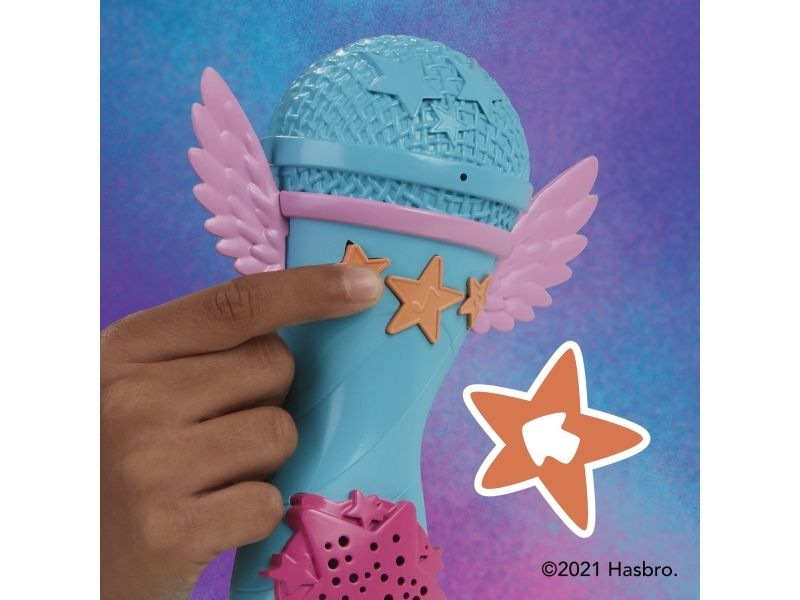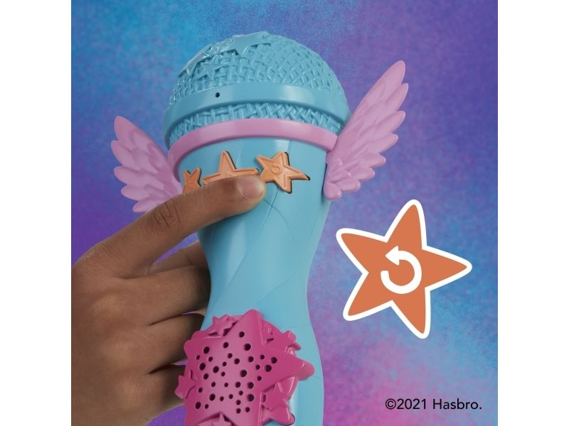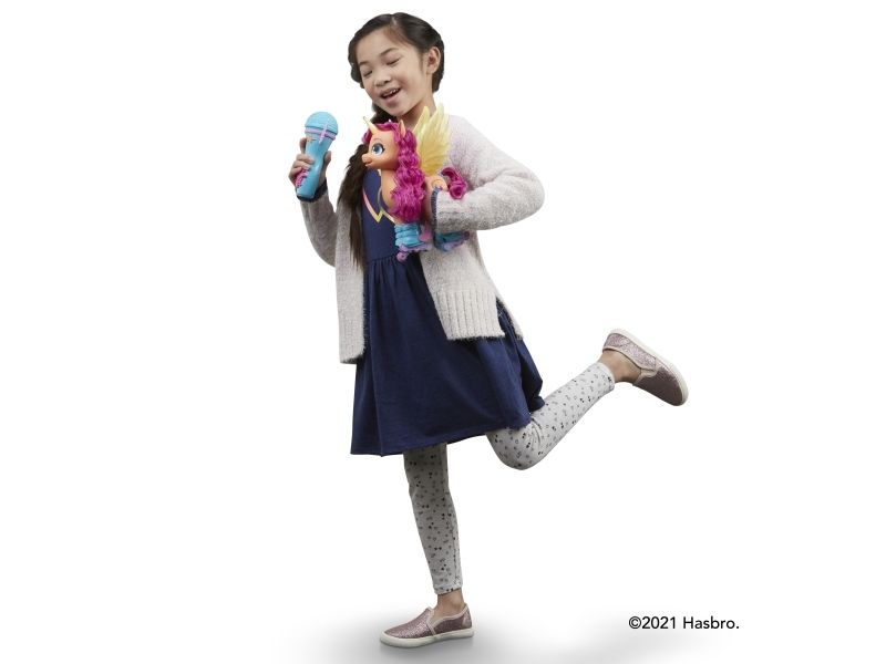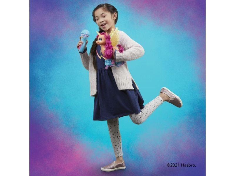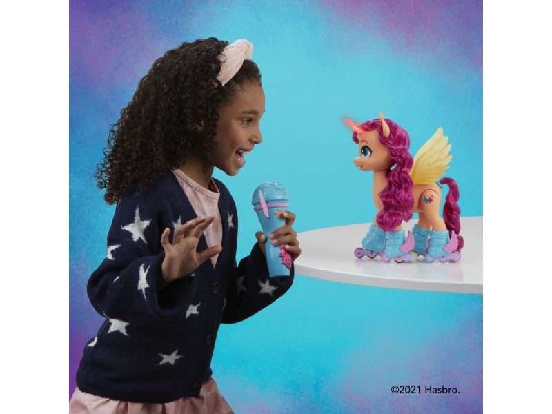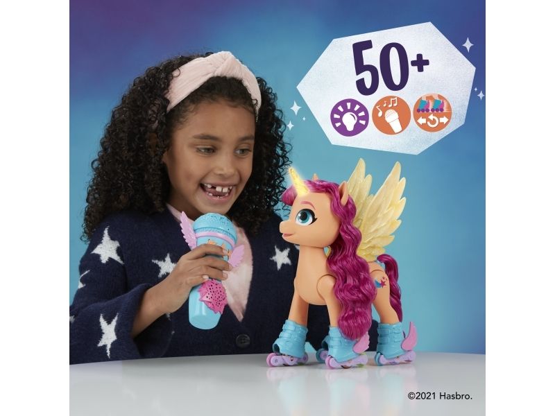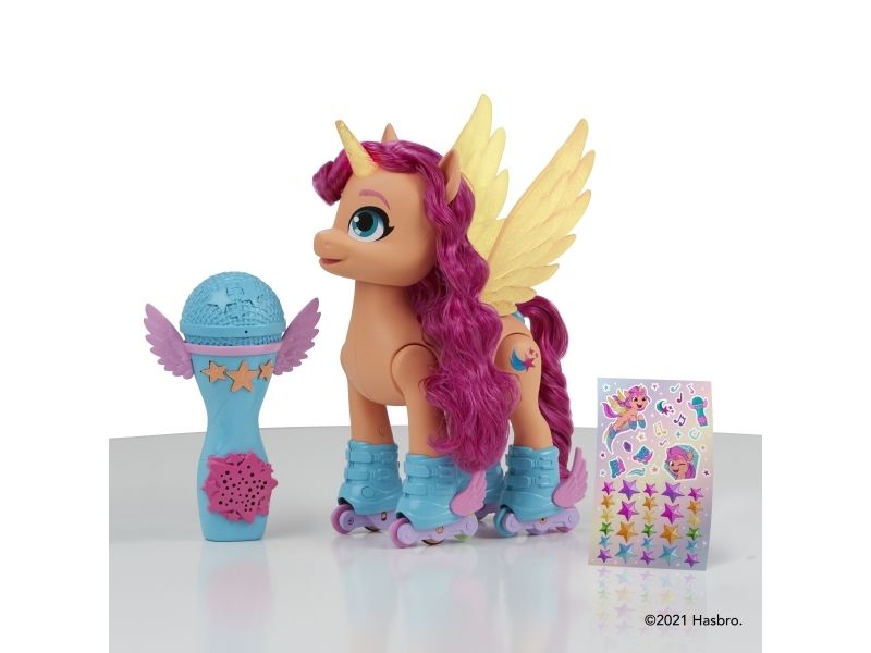 Get to know Sunny Starscout: an adventurous pony from Maretime Bay! Sing 'N Skate Sunny Starscout is an interactive pony figure that kids can control. Comes with a cordless microphone that can be used for singing or as a remote control. Use the buttons on the microphone to move the figure forward or spin her around. Kids can also shake the RC microphone to make the figure move! Figure moves her heads and wings while she skates and hums part of the song "Gonna Be My Day." Features over 50 combinations of lights, sounds, and movement. 9-inch orange pony figure has long, soft pink hair and a character-inspired shooting star Cutie Mark on one side. Fans new and old can imagine adventures with My Little Pony: A New Generation movie-inspired toys. Makes a great holiday or birthday gift for kids ages 5 years old and up! My Little Pony and all related characters are trademarks of Hasbro.